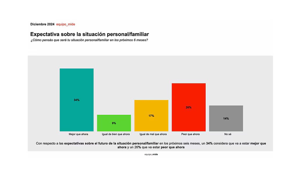 Con relación a la expectativa de país y personal para los próximos seis meses, la mayoría (38%) sostuvo que “estará mejor que ahora”, mientras que un 35% indicó que será “peor que ahora”. Esta paridad también se refleja en las cuestiones personales: una mayoría (34%) sostuvo que su situación, y la de su familia, será “mejor que ahora”, mientras que un 26% pronosticó que será “peor que ahora”.