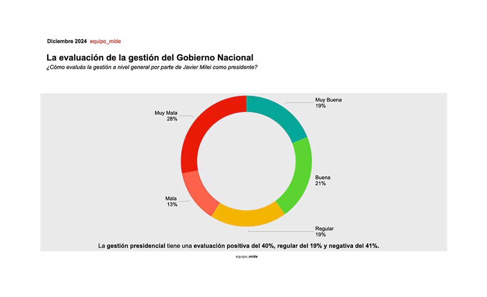 Según esta encuestadora, la popularidad del Presidente se situó en el 53 % en diciembre, consolidando un crecimiento de 7 puntos porcentuales desde octubre. Se trata del mayor diferencial positivo observado desde enero de este año, cuando comenzó a aplicar las primeras medidas de ajuste de su Gobierno.