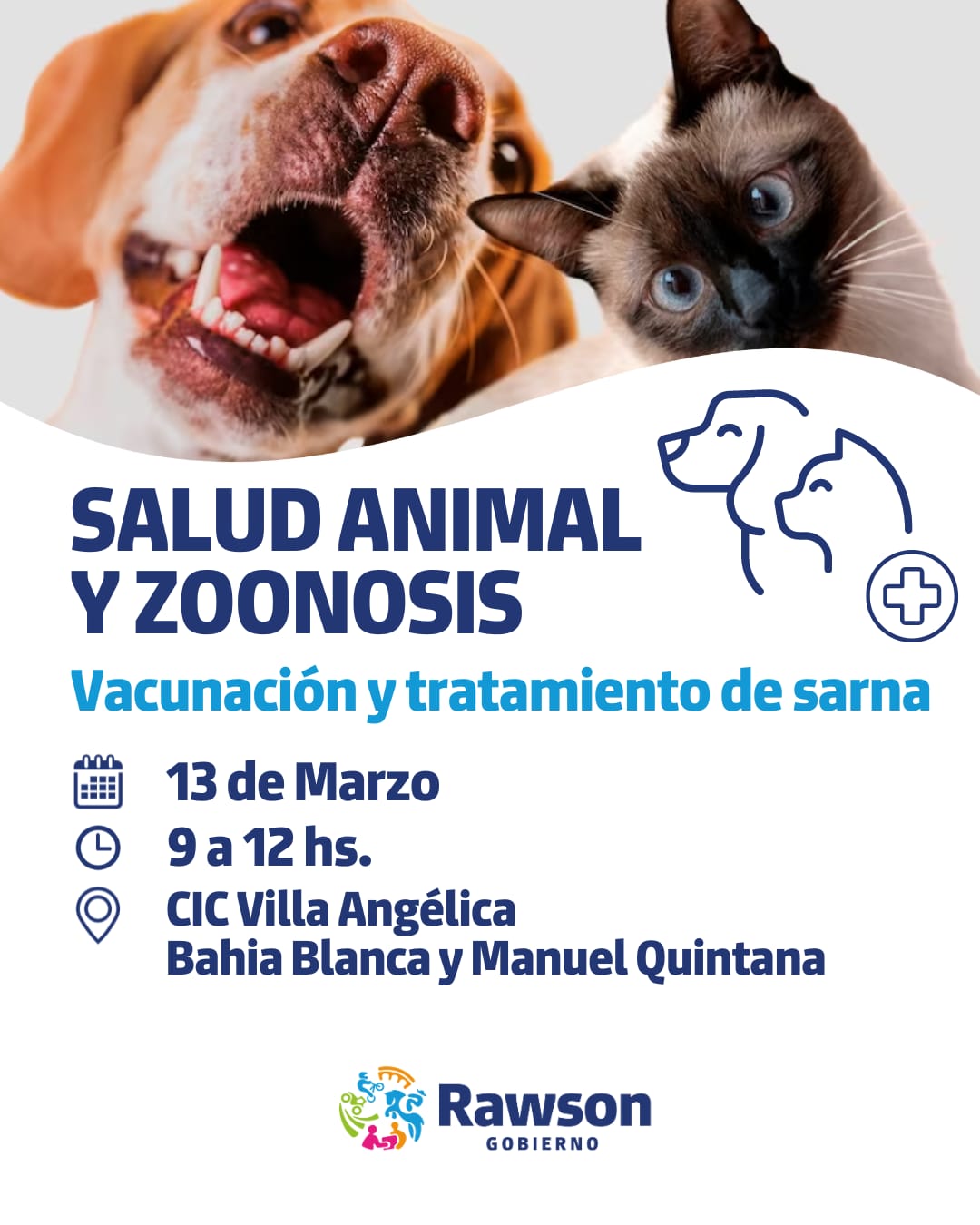 La Municipalidad de la Ciudad de Rawson informa el centro de salud animal llevará a cabo el operativo de Zoonosis,este miércoles 13 de marzo, en horarios de 09 a 12, en las instalaciones del playón deportivo del CIC de Villa Angelica, ubicado en Bahia Blanca y Manuel Quintana.