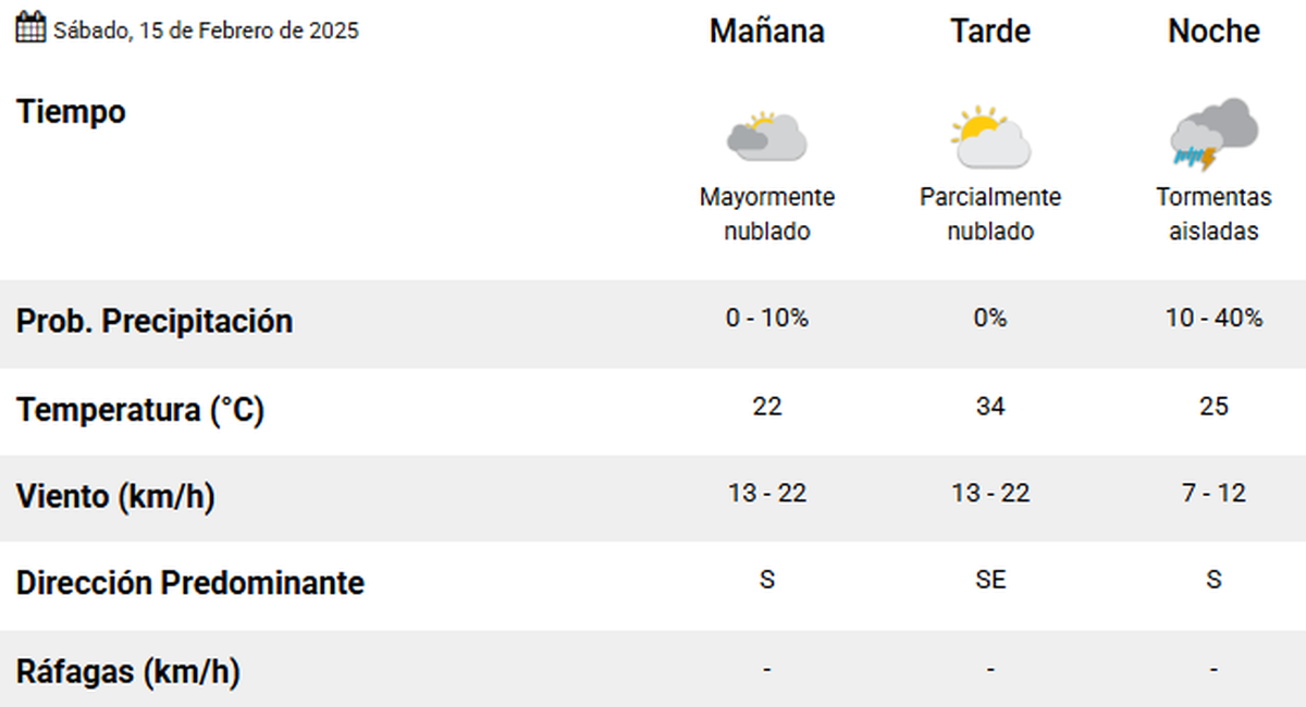 El Servicio Meteorológico Nacional anunció que este sábado las nubes le ganarán la pulseada al Sol en el cielo y la temperatura no superará los 34 grados, durante la tarde. De acuerdo al pronóstico del tiempo emitido a las 6, la mínima será de 22° por la mañana, la máxima de 34° y por la noche, descenderá a 25°.