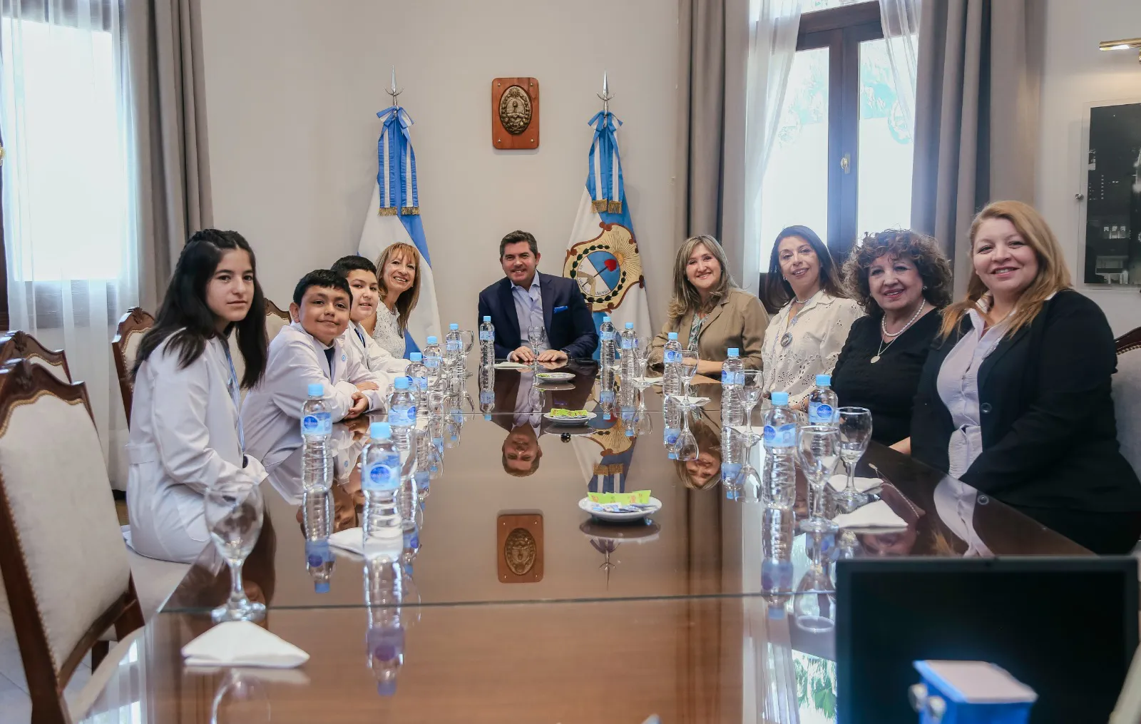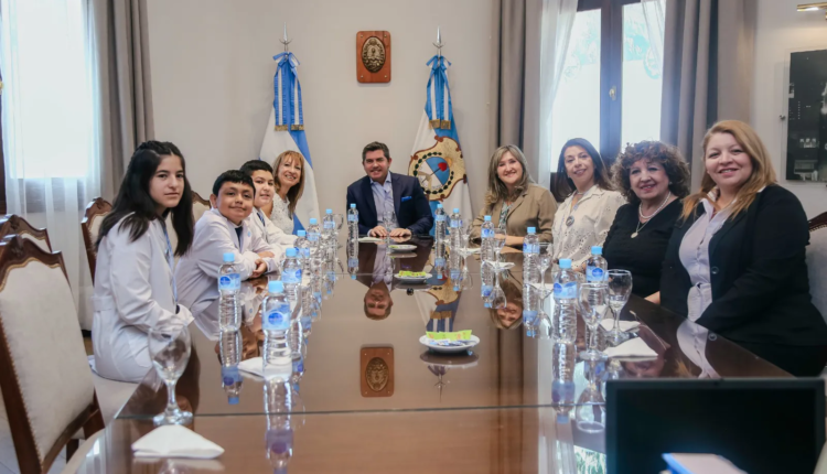 Acompañados por la ministra de Educación, Silvia Fuentes, los jóvenes Brisa Morán, Gabriel Ochoa y Jeremías Falcone, junto a las docentes Érica Ozán y Romina Corriente y la directora Nélida Díaz, presentaron al mandatario el proyecto innovador con el que obtuvieron el primer puesto entre escuelas de todo el país.