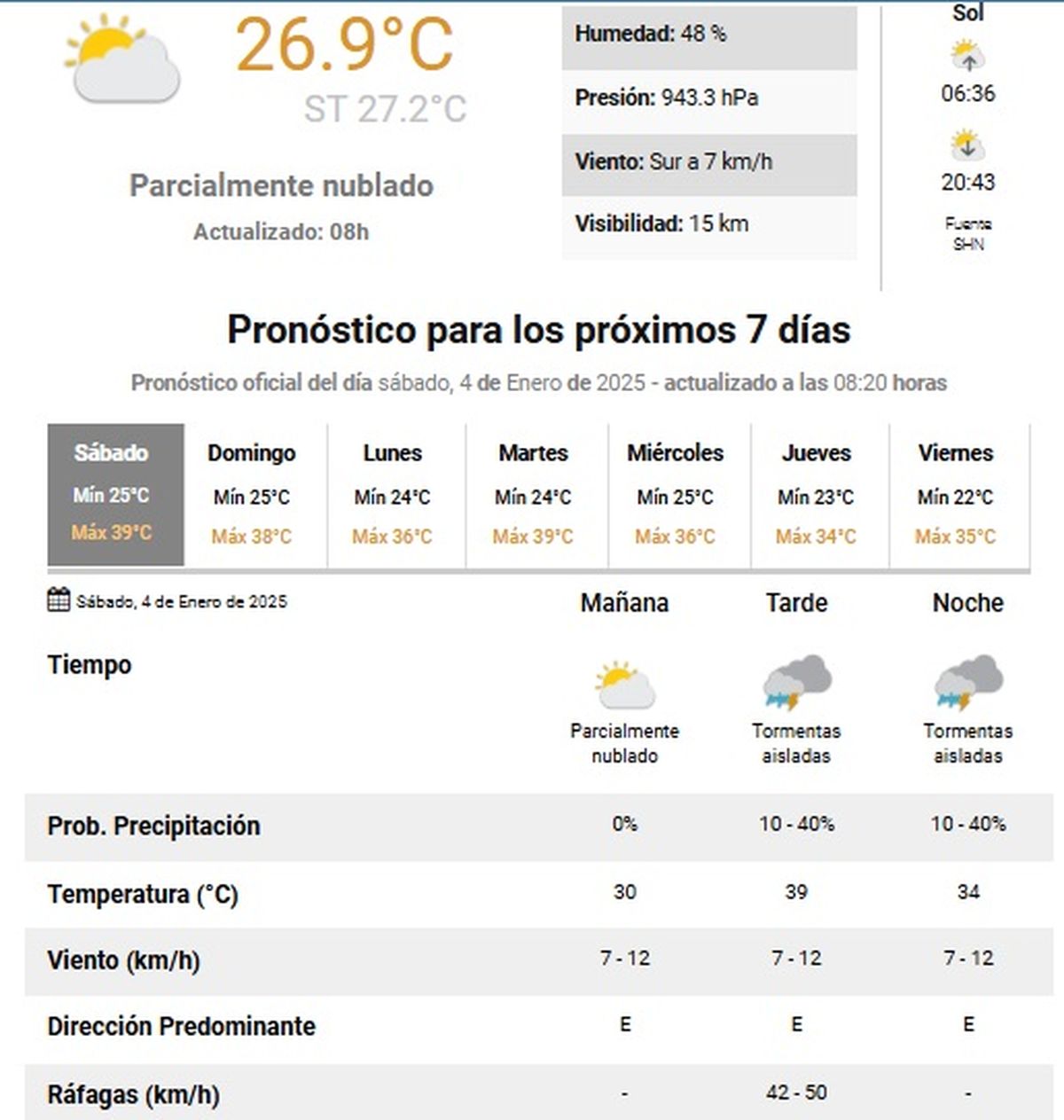 Para el domingo, el SMN anunció una mínima de 25°C y máxima de 38°C, con cielo mayormente nublado y leve brisa del sector este. En la tarde noche volverá la probabilidad de hasta 40% de tormentas aisladas en el territorio provincial.