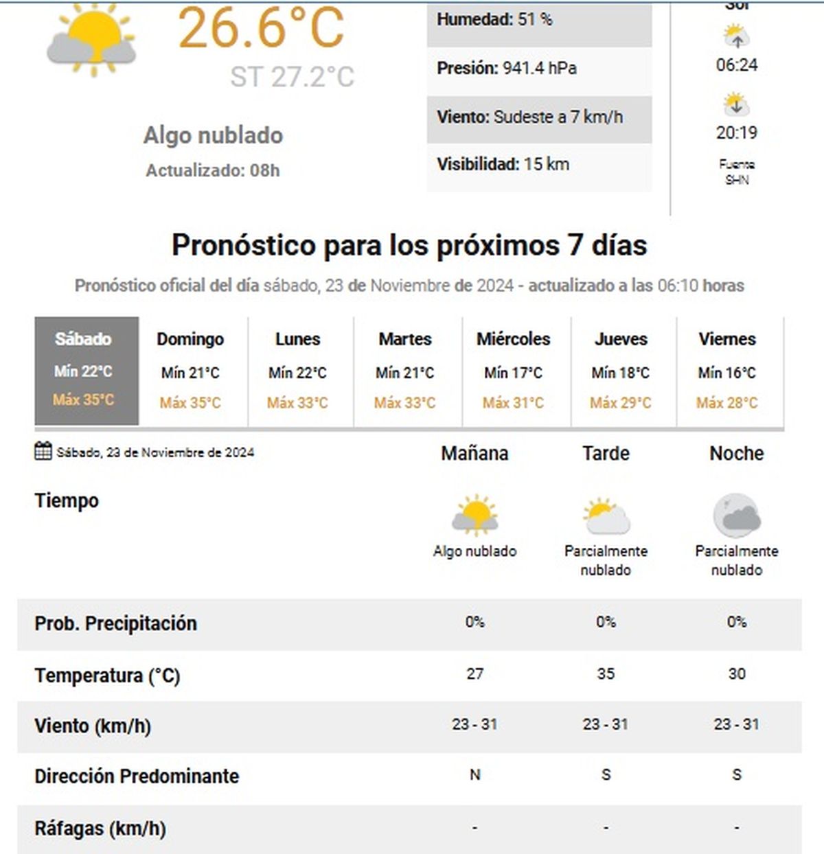 El Servicio Meteorológico Nacional anunció una máxima de 35°C para este sábado, con cielo de algo a parcialmente nublado y leve brisa del sur, con una intensidad de 23 a 31 km/h.