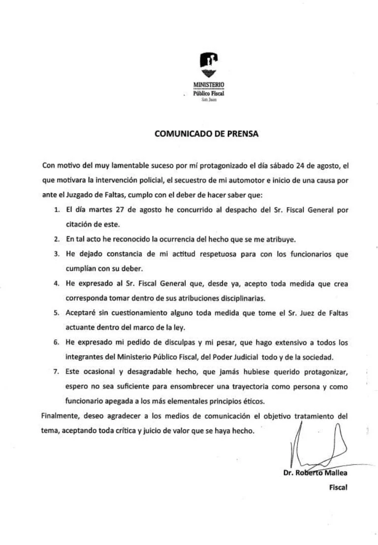 El fiscal Roberto Mallea, de la Unidad Fiscal de Investigación (UFI) ANIVI, emitió un comunicado pidiendo disculpas públicas tras ser detenido por manejar en estado de ebriedad. Mallea fue interceptado durante un operativo de tránsito de la Policía de San Juan cerca del Parque de Mayo, donde se le realizó un control de alcoholemia que reveló un nivel de 1.4 gramos de alcohol por litro de sangre, casi tres veces el límite permitido para conducir.
