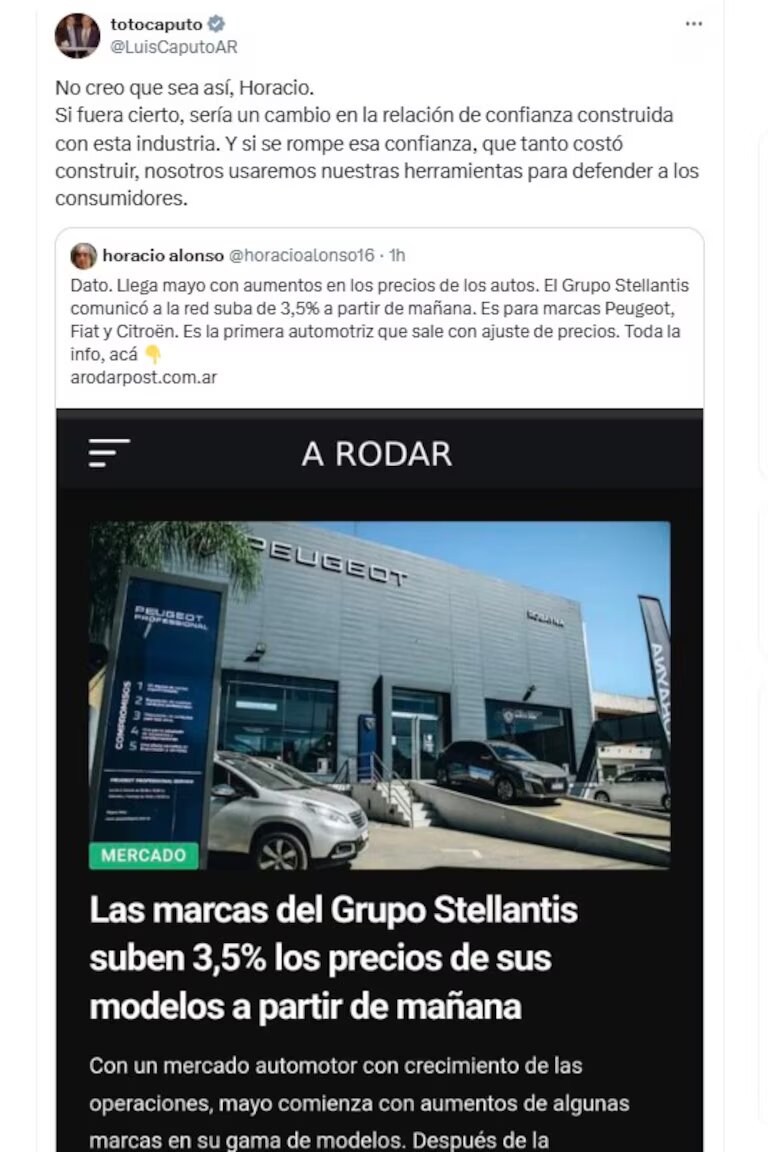 El ministro de Economía, Luis Caputo, lanzó una advertencia pública hacia las automotrices tras conocerse que una de las principales compañías del sector comunicó un aumento de precios del 3,5% para mayo. La reacción del funcionario surgió como respuesta directa a un posteo del periodista especializado Horacio Alonso, quien en la red social X informó que Grupo Stellantis notificó a su red de concesionarios una suba de ese porcentaje desde el primer día del mes.