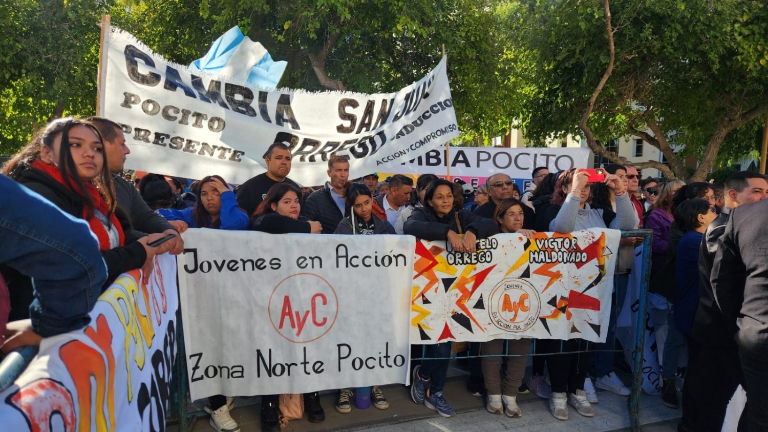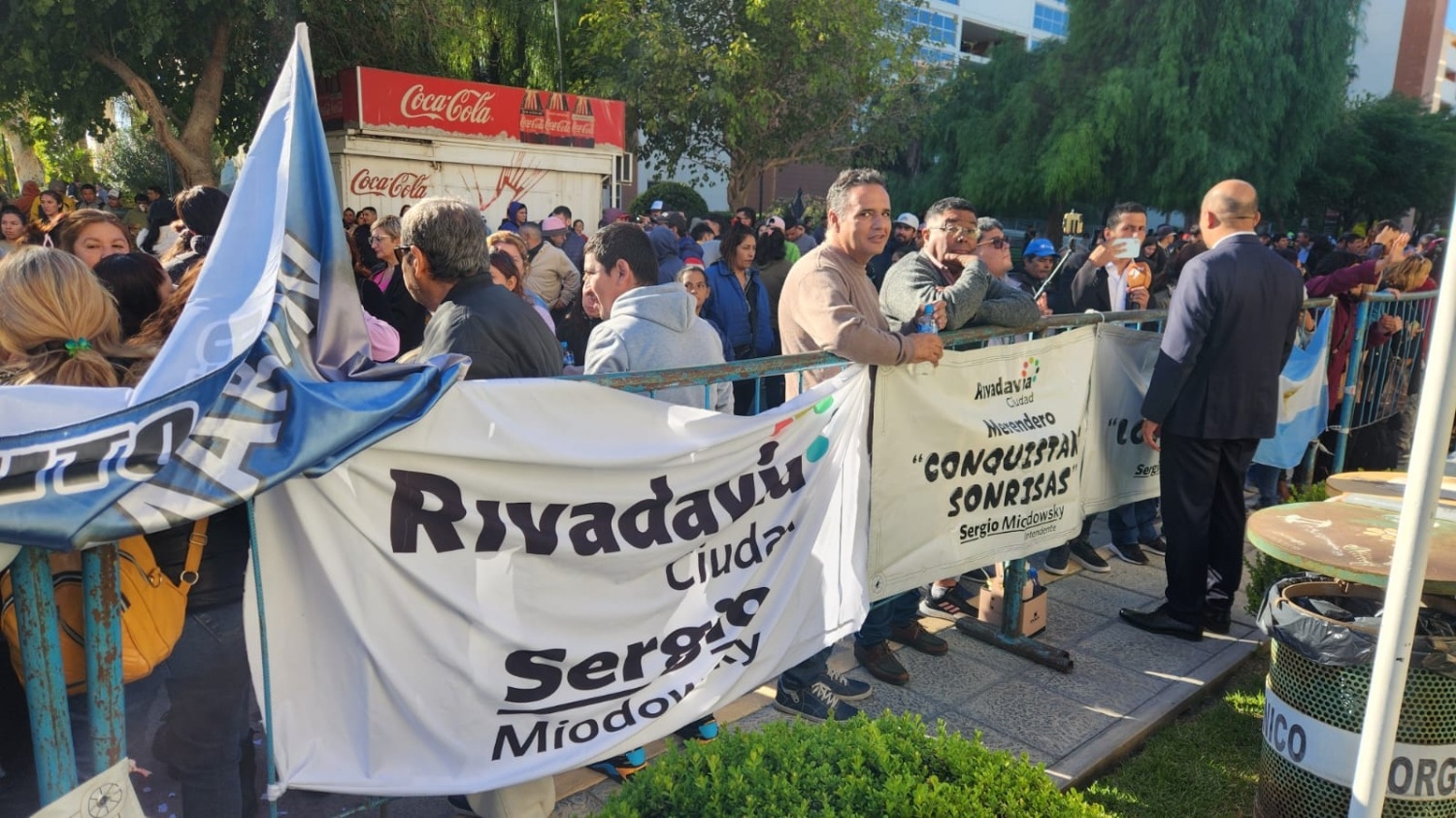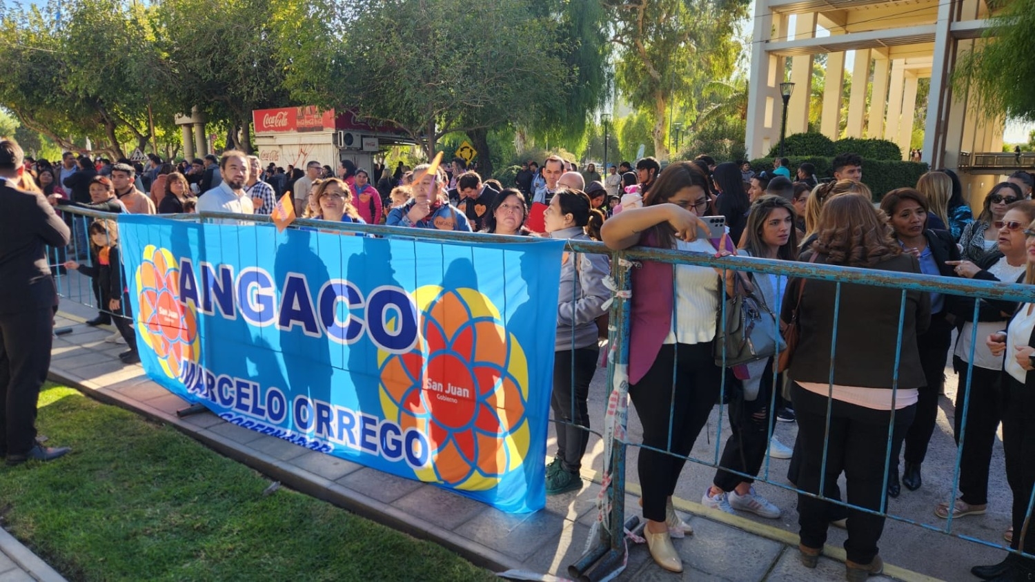 Desde primeras horas del martes, agrupaciones de Rawson, Angaco, Zonda, Rivadavia, 25 de Mayo, 9 de Julio y Pocito se movilizaron hasta la Legislatura, colmando los alrededores con banderas y cánticos. Según fuentes policiales, entre 2.500 y 3.000 personas se congregaron para seguir de cerca el discurso del mandatario.