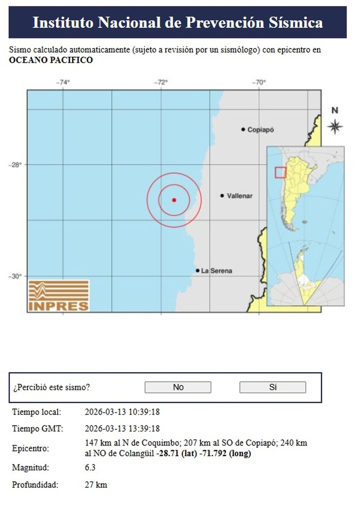 Un sismo de 6.5 grados de magnitud se registró en la zona norte de Chile y fue percibido en varias provincias argentinas, especialmente en San Juan, La Rioja, Mendoza y Córdoba, según informó el Instituto Nacional de Prevención Sísmica (INPRES).