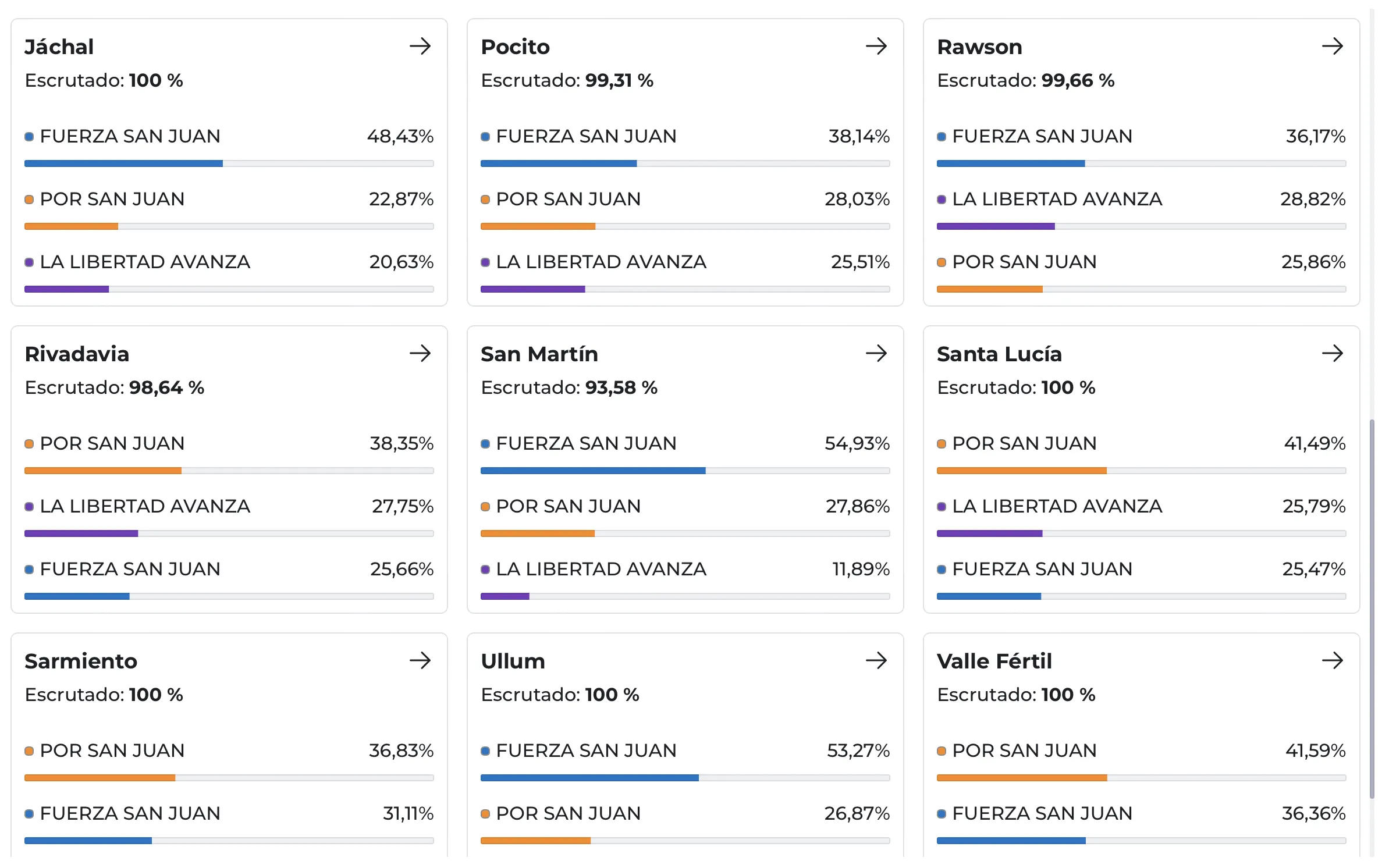 Fuerza San Juan ganó en once distritos, Por San Juan en seis y La Libertad Avanza se impuso en la Capital.