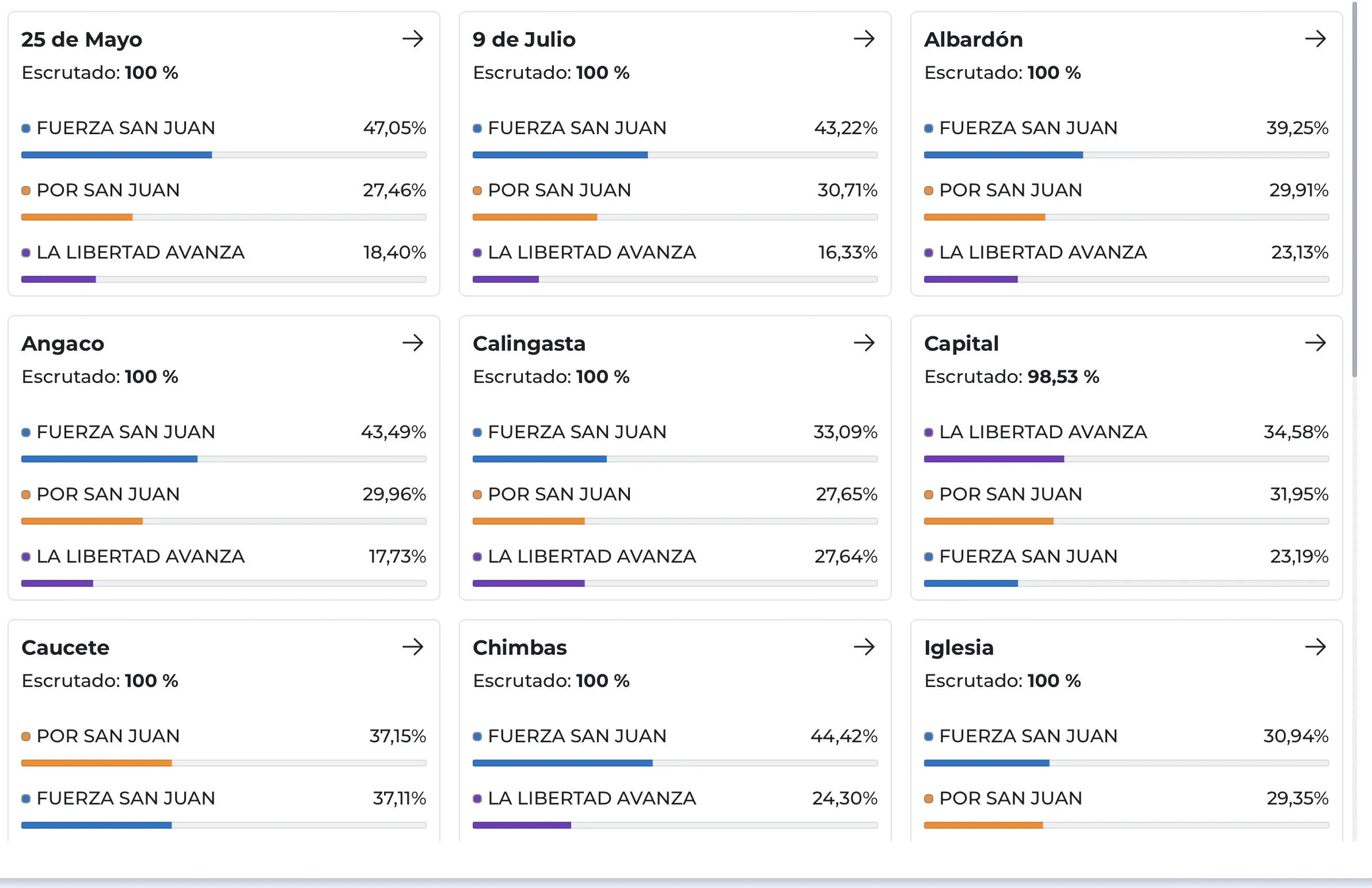 Por su parte, La Libertad Avanza obtuvo su mejor desempeño en los grandes centros urbanos. Se impuso en la Capital, donde alcanzó el 34,58%, superando a Fuerza San Juan (32,7%) y a Por San Juan (28,4%).