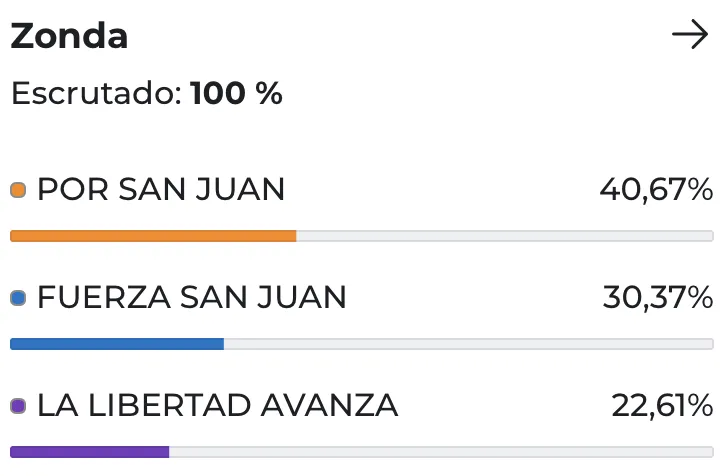 El resultado final de las elecciones provinciales en San Juan confirmó un mapa político repartido. Fuerza San Juan se posicionó como la fuerza más votada con el 34,42% de los sufragios (145.074 votos), seguida por Por San Juan, con el 31,05% (130.858 votos), y La Libertad Avanza, que alcanzó el 25,99% (109.549 votos).