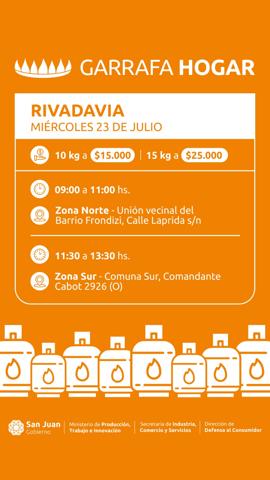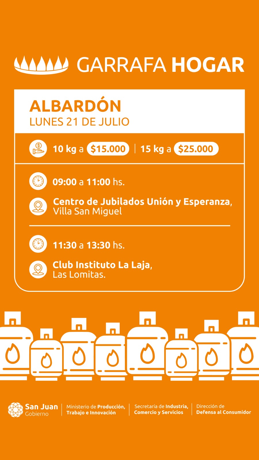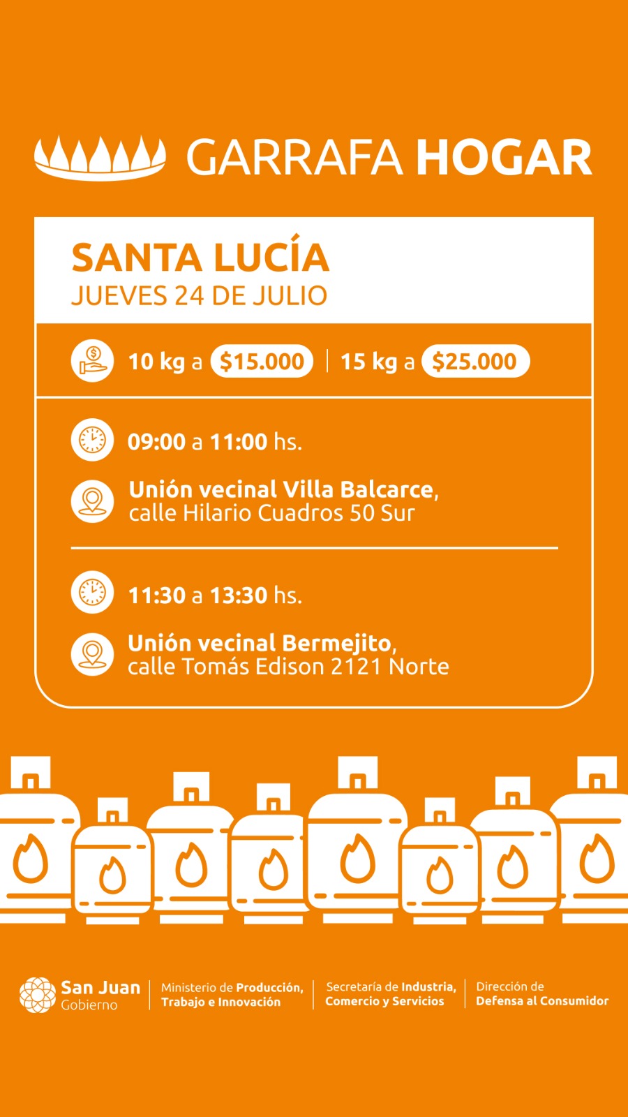 El Gobierno de San Juan, por intermedio del Ministerio de Producción, Trabajo e Innovación destaca que el programa Garrafa Hogar, iniciará este lunes 21 de julio una nueva ronda de distribución de garrafas subsidiadas en cinco departamentos de la provincia. La recorrida se extenderá hasta el viernes 25 de julio, atendiendo a familias registradas en zonas donde el acceso al gas natural es limitado.