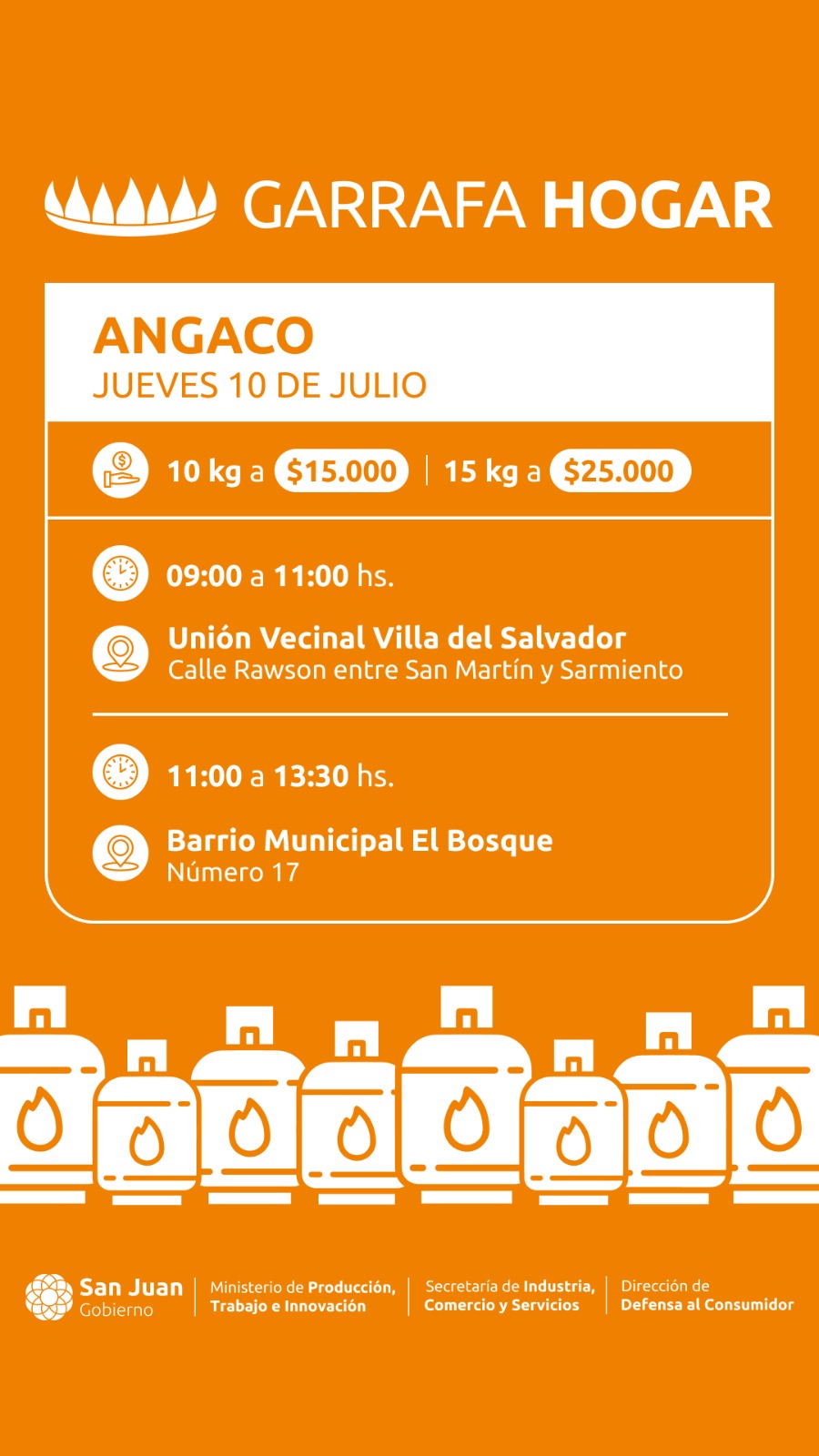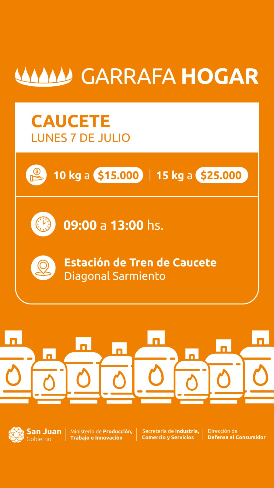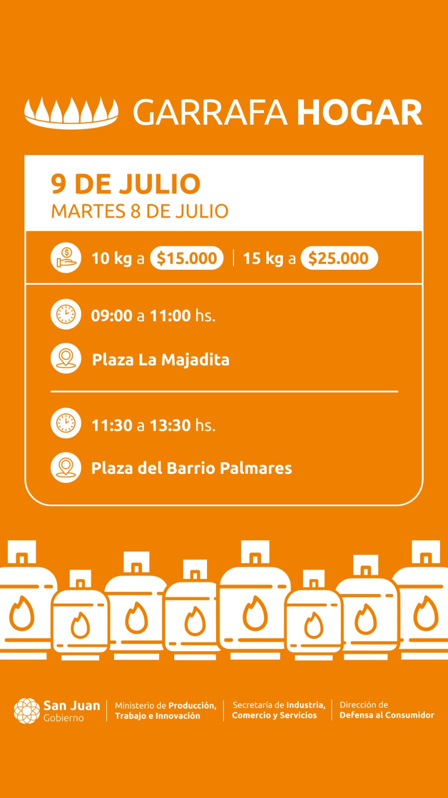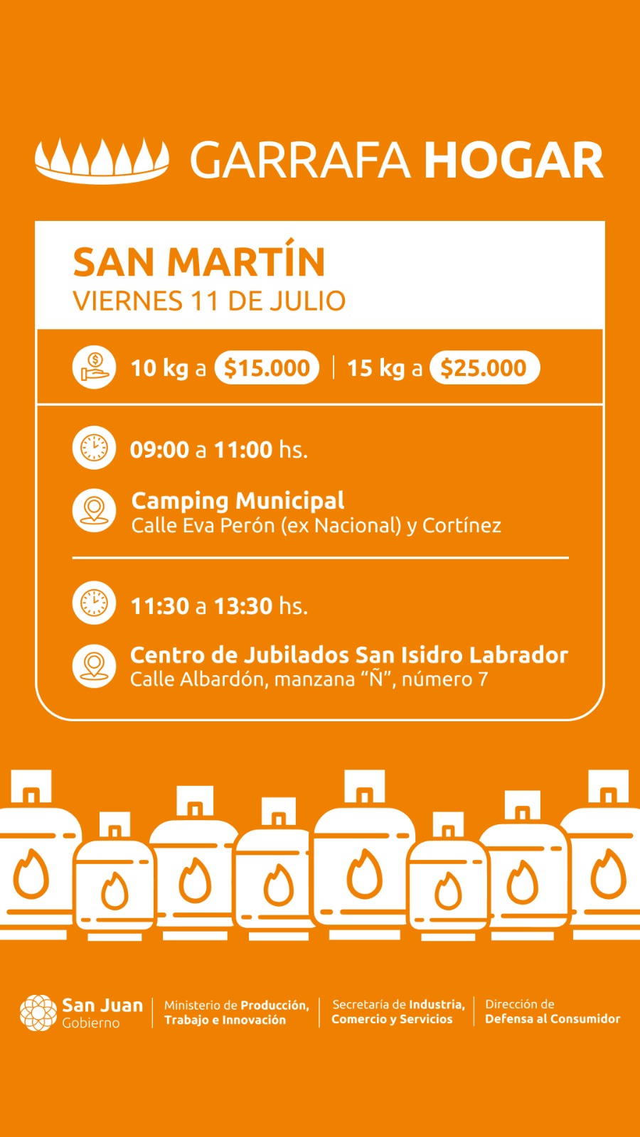 La herramienta Garrafa Hogar continúa su recorrido por la provincia, dando inicio a su tercer operativo desde el lunes 7 hasta el viernes 11 de julio. En esta etapa, visitará las localidades de Caucete, 9 de Julio, Angaco y San Martín. Esta iniciativa del Gobierno de San Juan, coordinada por el Ministerio de Producción, Trabajo e Innovación a través de la Dirección de Defensa al Consumidor, garantiza a las familias el acceso a gas envasado a precios regulados, hasta un 40 % por debajo de los valores del mercado.