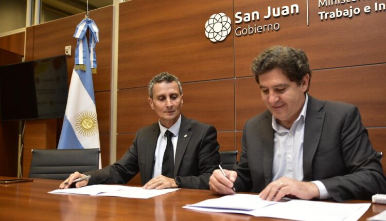 Los ministros Gustavo Fernández (de Producción, Trabajo e Innovación) y Carlos Platero (de Familia y Desarrollo Humano) junto al presidente Manuel Rodríguez (de la Agencia Calidad de San Juan) rubricaron la firma para la concreción de este importante convenio para el beneficio de las familias sanjuaninas.