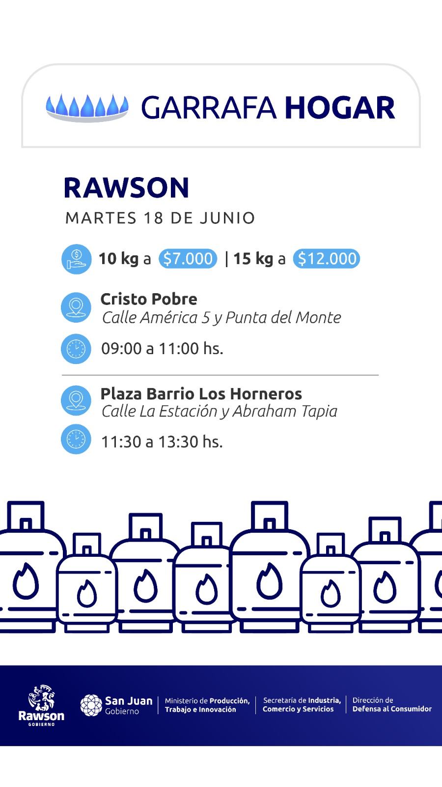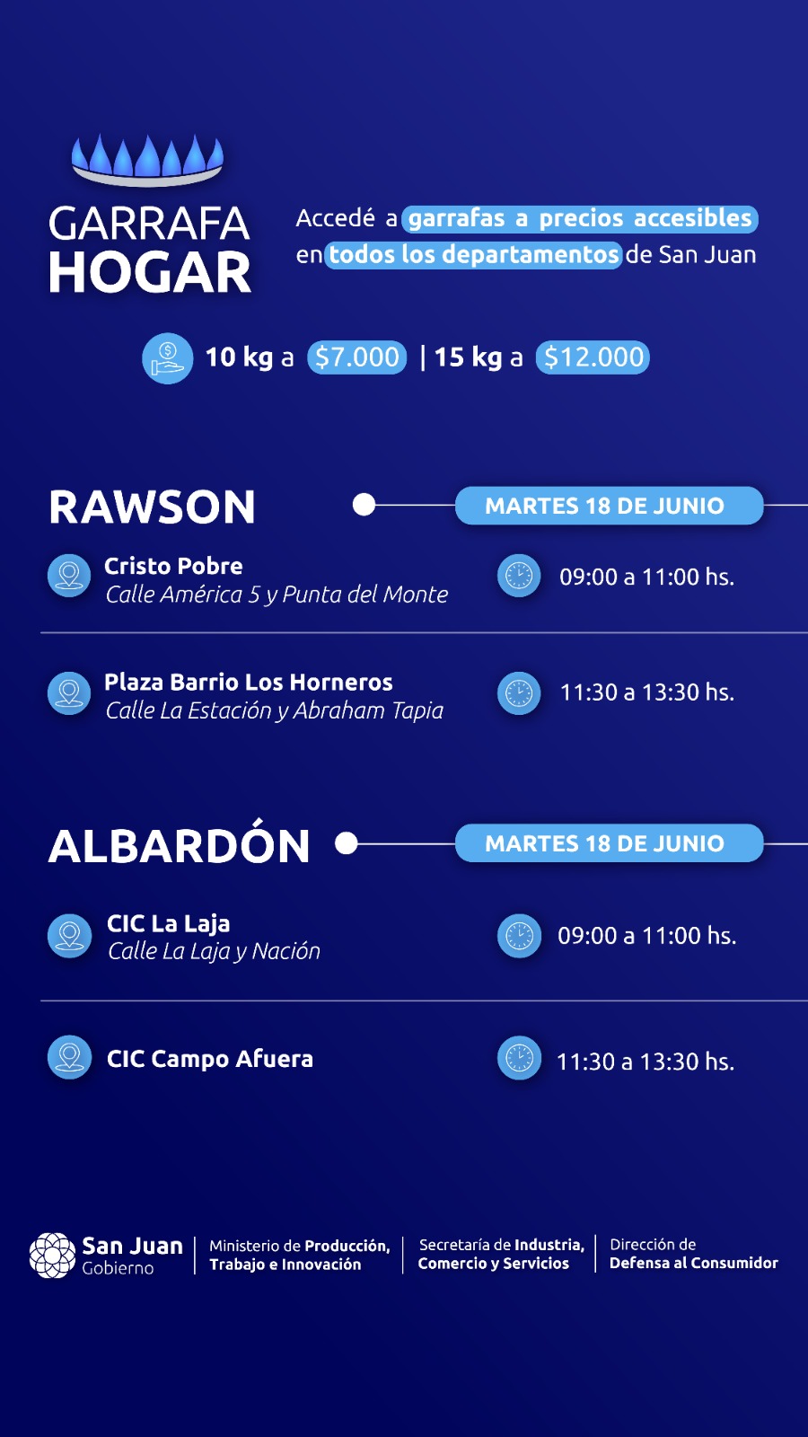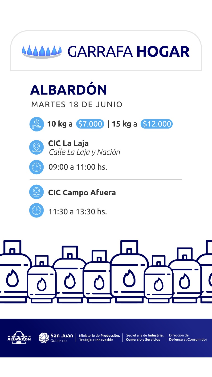 En el mismo día y en forma simultánea se trasladarán garrafas de 10 kg. y 15 kg. en Albardón. En el turno de las 9 hs. a 11 hs. el personal de Defensa al Consumidor estará en el CIC de La Laja (calle La Laja y Nación). A partir de las 11,30 hs. a 13,30 hs. se hará en el CIC Campo Afuera.