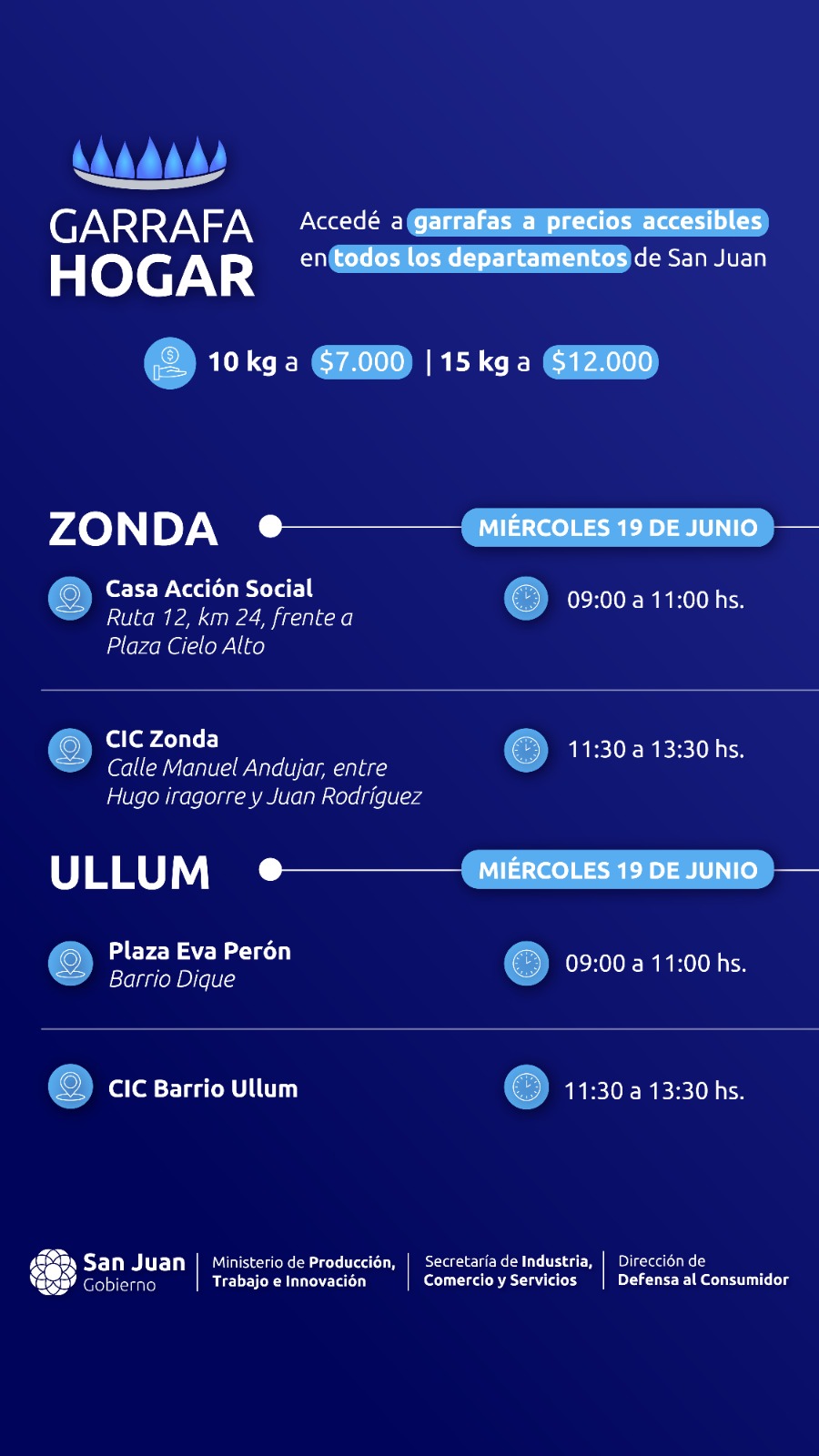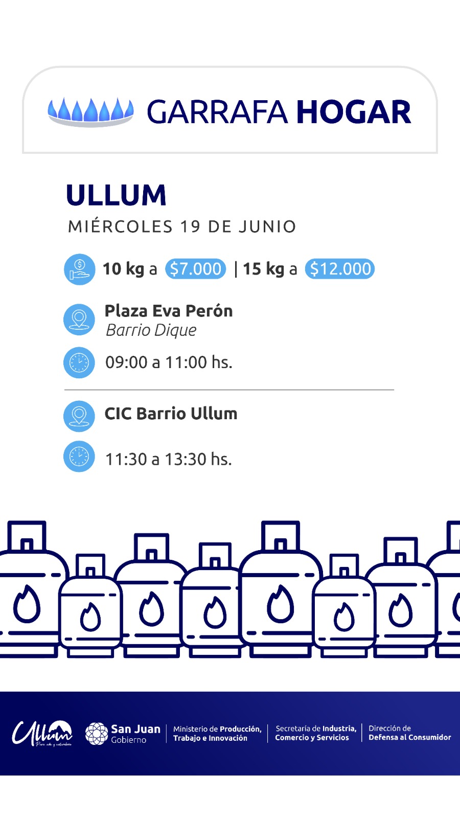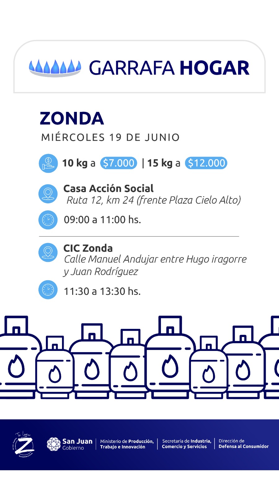 En el mismo día y en forma simultánea se trasladarán garrafas de 10 kg. y 15 kg. en Albardón. En el turno de las 9 hs. a 11 hs. el personal de Defensa al Consumidor estará en el CIC de La Laja (calle La Laja y Nación). A partir de las 11,30 hs. a 13,30 hs. se hará en el CIC Campo Afuera.