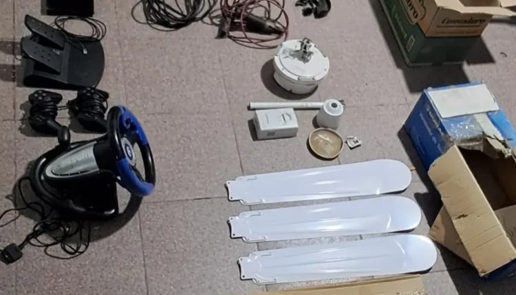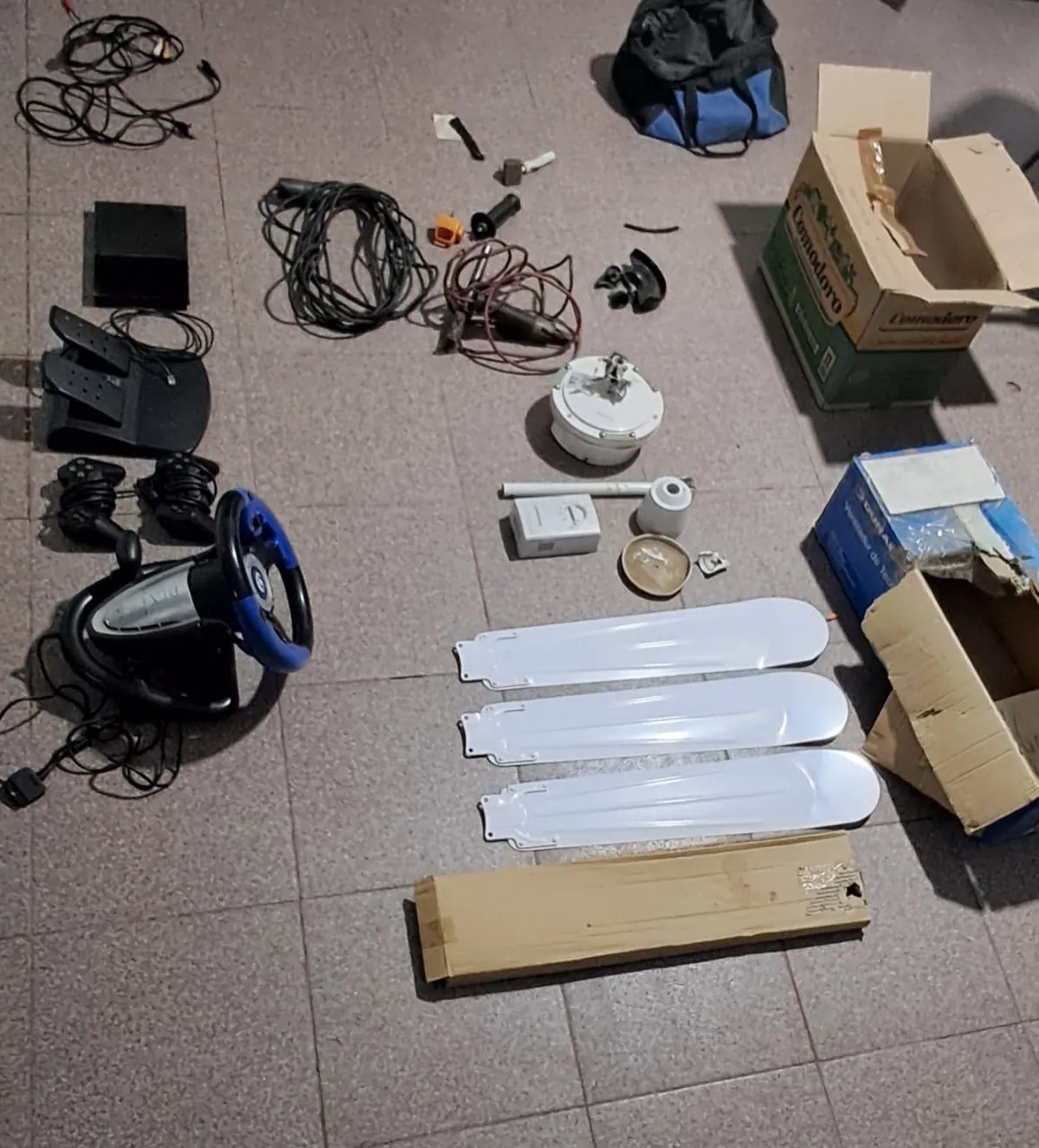 Entre los elementos secuestrados se encontraban una consola PlayStation 2 con accesorios, taladros, amoladoras, un motor de ventilador de techo y otros artículos de trabajo y uso doméstico.