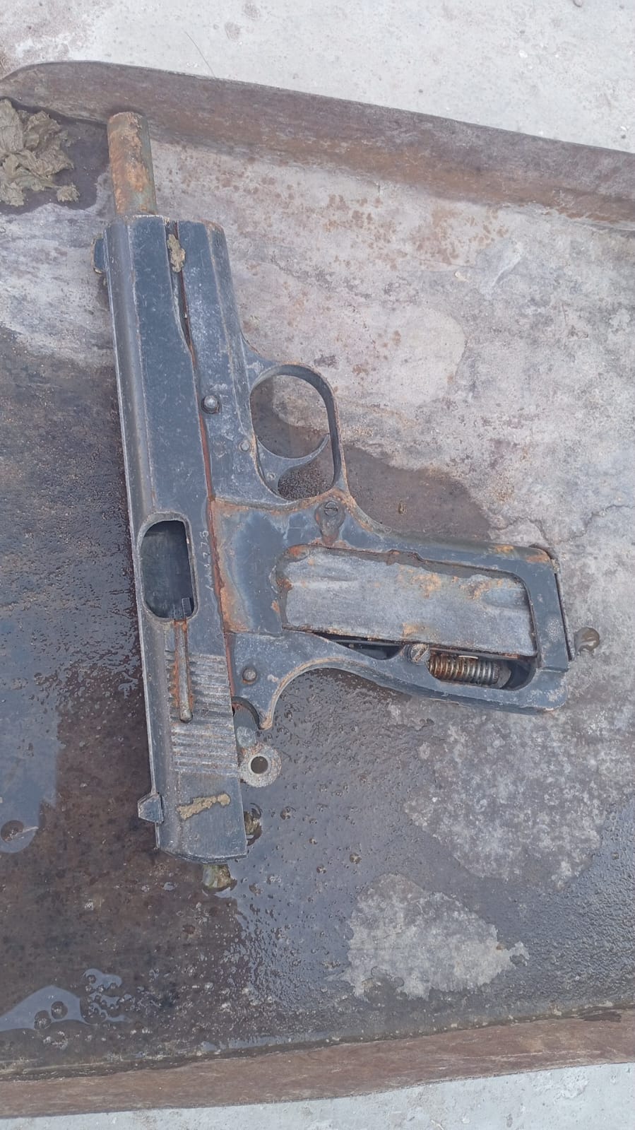 Una pistola Hi Power calibre 9 mm fue hallada este mediodía en un canal de calle 6, entre San Miguel y Meglioli, Pocito. El arma estaba con su cargador.