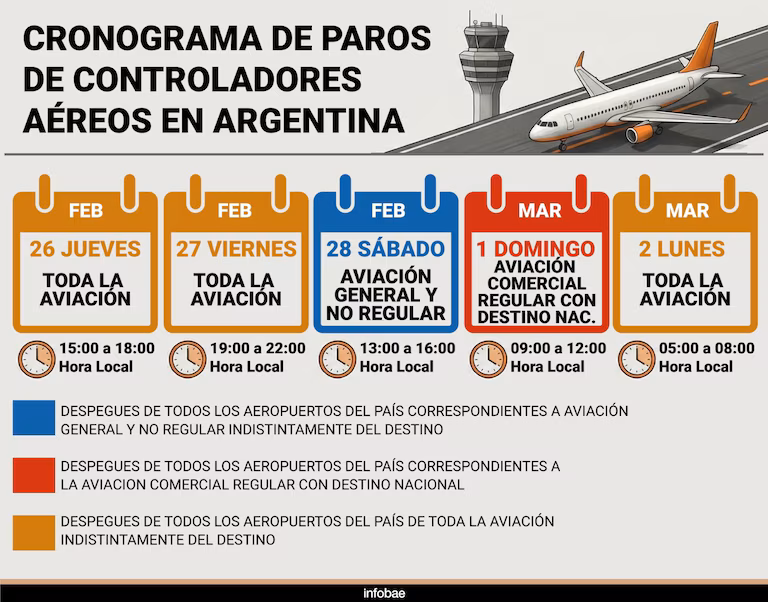 Según lo informado, la protesta abarcará franjas horarias escalonadas y restringirá exclusivamente la autorización para el despegue de aeronaves, sin afectar operaciones ya en curso. Serán varios días que, previsiblemente, haya demoras o reprogramaciones para algunos vuelos, a excepción de las aeronaves en emergencia, sanitarias, humanitarias, de Estado o búsqueda y salvamento: