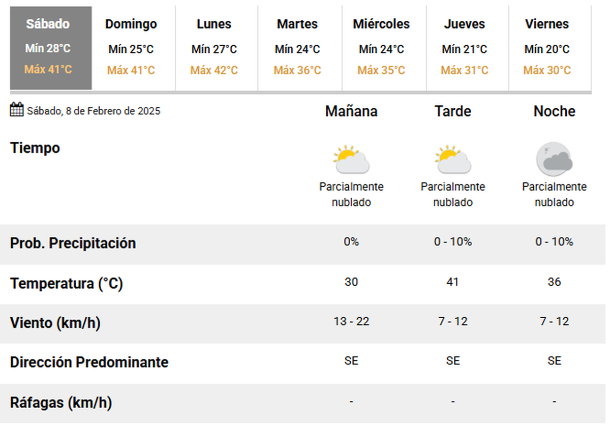 De acuerdo a lo informado por el organismo nacional, el termómetro oscilará entre los 28 y 41 grados durante la jornada de hoy, junto a una brisa del sector sureste.
