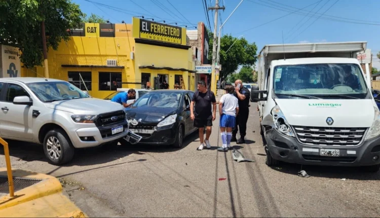 Un choque en cadena ocurrido este sábado en Capital generó gran movimiento en una transitada esquina. El siniestro se produjo sobre Paula Albarracín de Sarmiento y Sargento Cabral, donde cuatro vehículos colisionaron, entre ellos un camión y un patrullero policial.