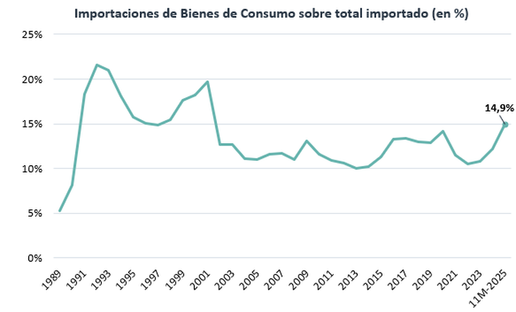 En particular, los bienes de consumo ya concentran el 15% de las compras externas, el valor más alto desde comienzos de siglo y apenas 2 puntos porcentuales por debajo del promedio de los 90. En este contexto, la proporción de empresas que reemplazó producción propia con bienes importados pasó del 5,3% al 10,1% entre el primer trimestre de 2025 y el segundo de dicho año.