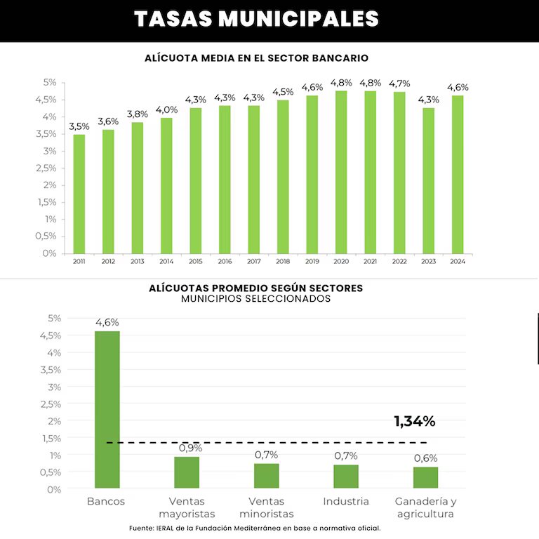 Para el caso de las tasas municipales, la tasa efectiva es de 4,6% para los bancos, bien por encima del promedio para todos los sectores, de 1,34 por ciento. El 2020 y 2021 tuvieron incluso alícuotas mayores, de 4,8 por ciento.