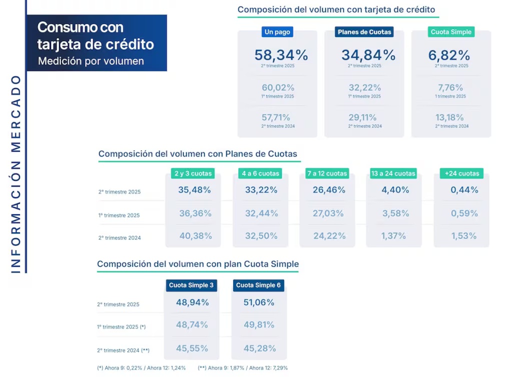 El detalle de las operaciones con tarjeta de crédito también mostró que la baja de la inflación y tasas del segundo trimestre favoreció el endeudamiento con plásticos, aún a pesar de la paulatina eliminación del plan oficial Cuota Simple, que finalmente ocurrió el 30 de junio. Para reemplazar esa opción, los adquirentes, bancos y emisoras lanzaron sus propias alternativas de financiación.