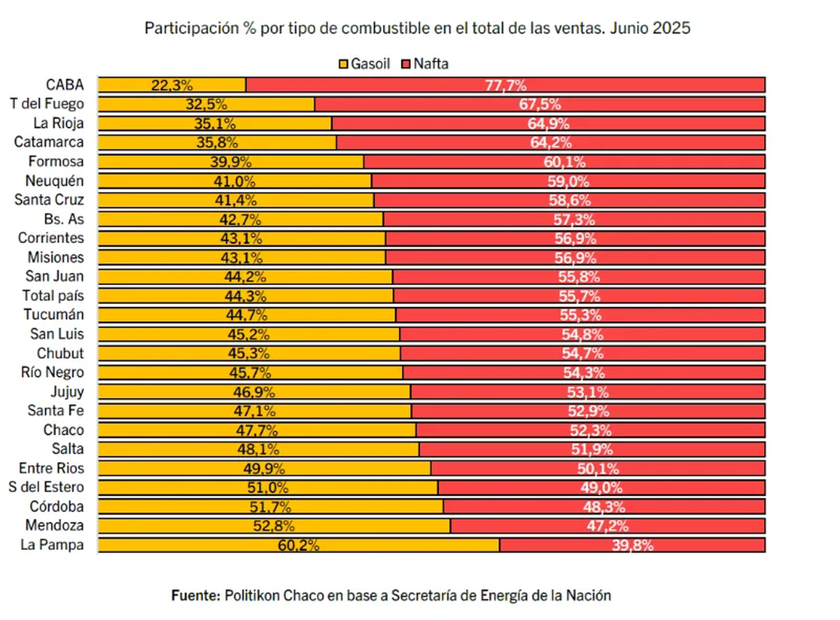 Ese incremento mayor en las naftas que en el gasoil, que viene dándose en prácticamente todos los meses, se refleja en la composición regional, al punto que el segundo combustible es minoría en la mayoría de las jurisdicciones y sólo constituye la mayoría en Santiago del Estero, Córdoba, Mendoza y La Pampa, traccionado principalmente por la actividad rural.