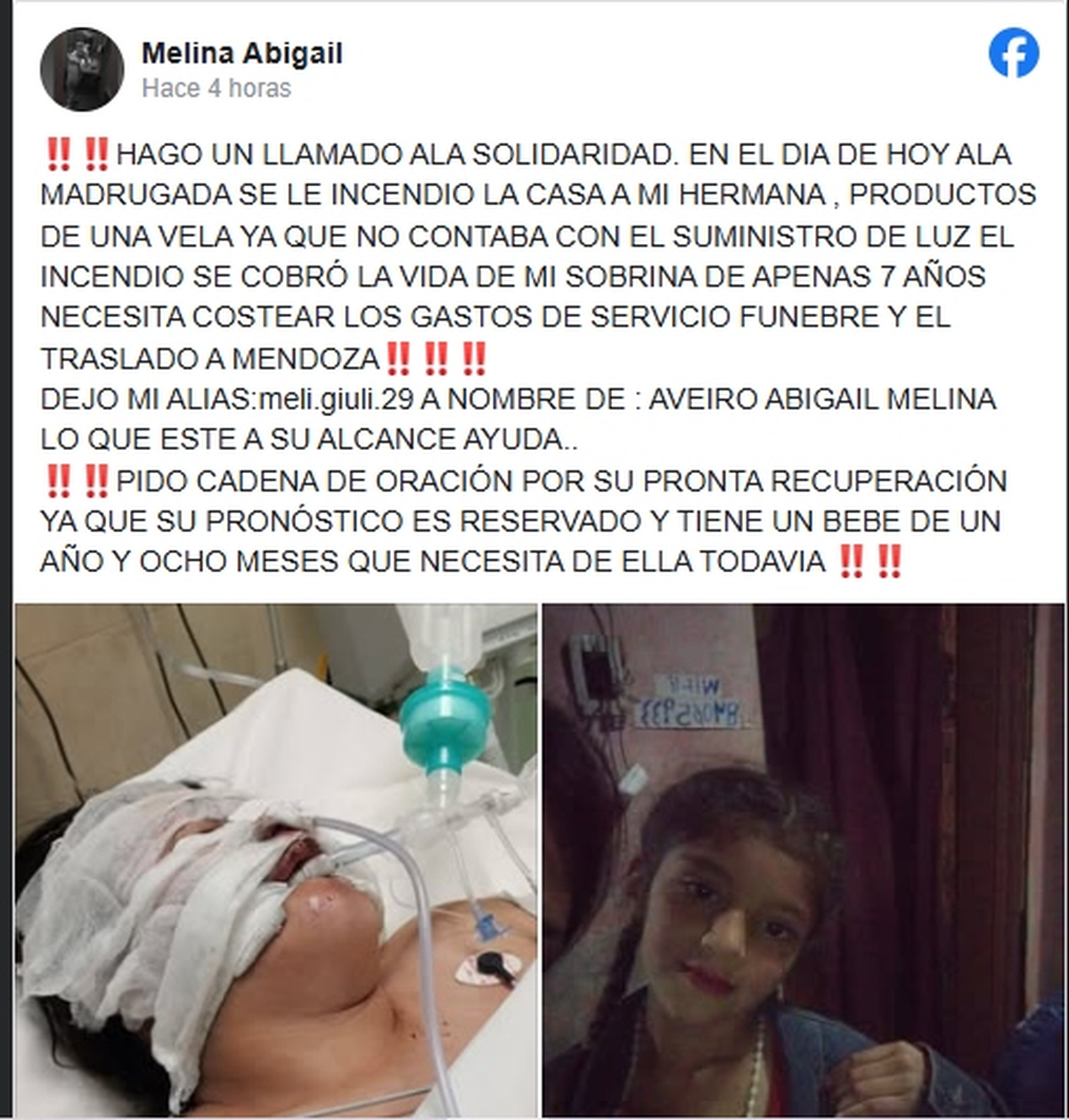 “Hago un llamado a la solidaridad. A mi hermana se le incendió la casa con una vela, ya que no tenía luz. El incendio se cobró la vida de mi sobrina de apenas 7 años. Necesitamos costear el servicio fúnebre y el traslado. Dejo mi alias: meli.giuli.29 a nombre de Aveiro Abigail Melina. Cualquier ayuda es bienvenida. Pido cadena de oración por su recuperación, ya que está en estado reservado y tiene un bebé que aún la necesita”.