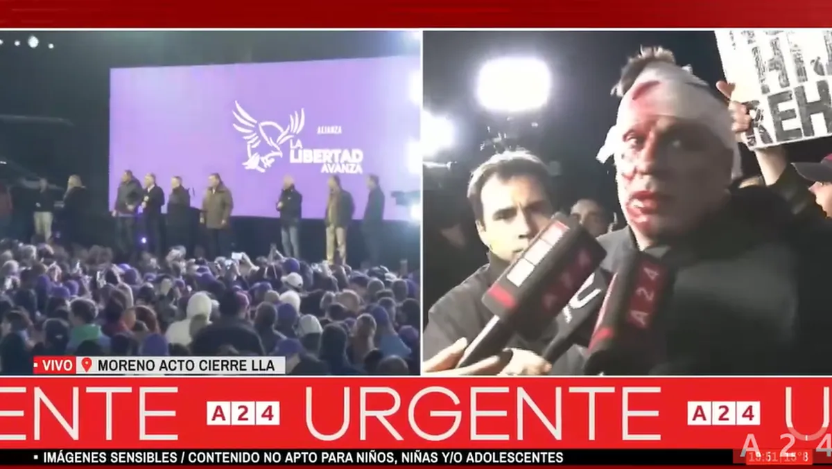 Afuera del predio de Moreno en donde Javier Milei cerró la campaña bonaerense, se registraron momentos de tensión en donde la agresión y los proyectiles terminaron impactando en Cristian Mercatante, de Desayuno Americano. “Me tiraron una botella”, reconoció el periodista con el rostro ensangrentado y tuvo que ser atendido por una ambulancia.