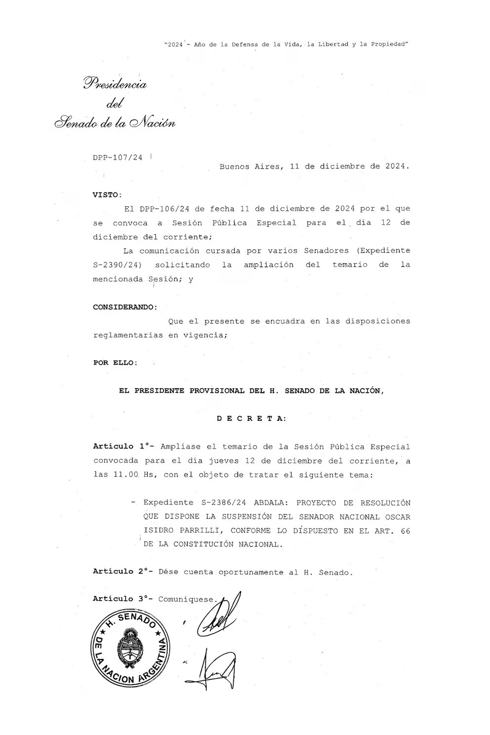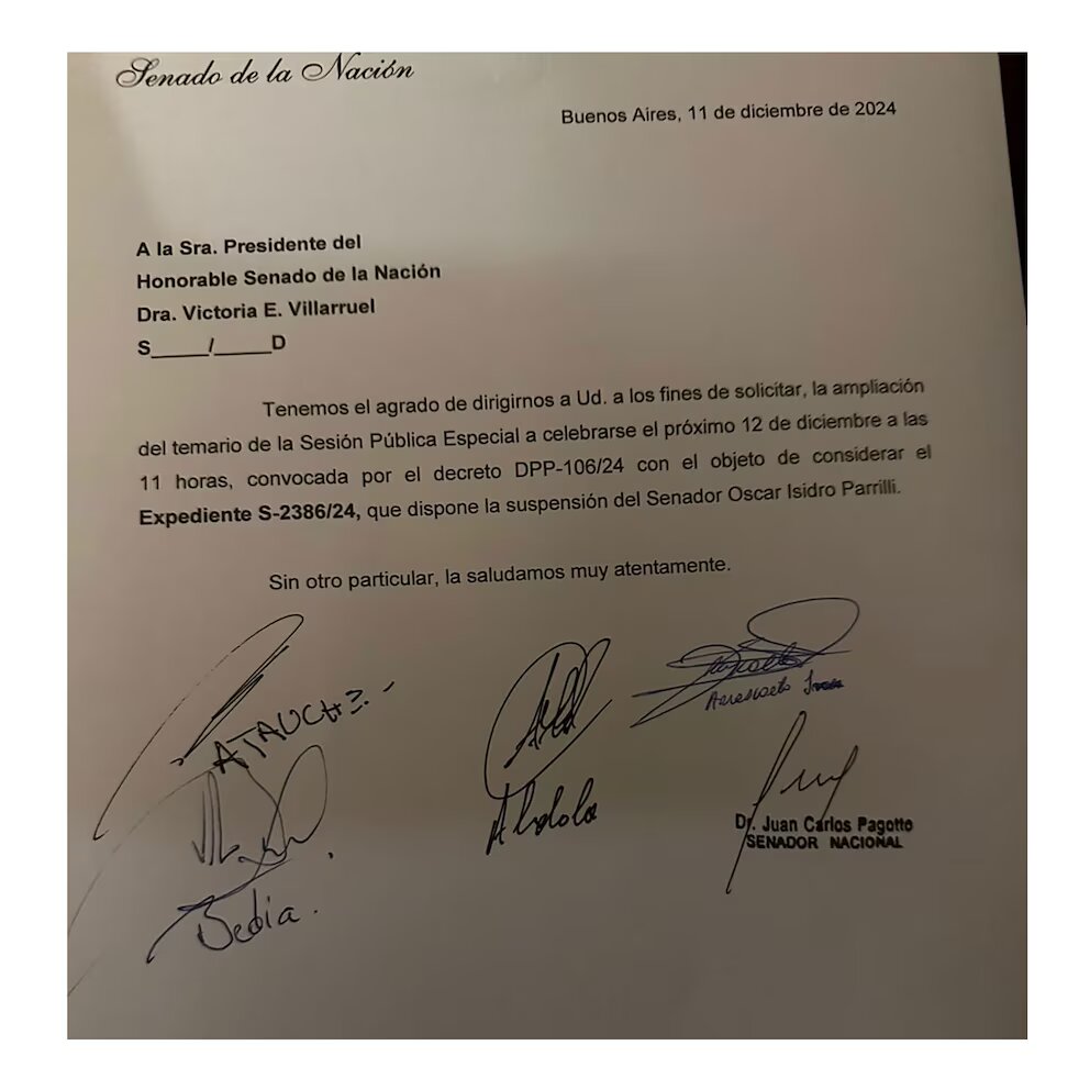 Tras la convocatoria de este mediodía para sesionar mañana y debatir la expulsión de la Cámara alta o la suspensión hasta el 1 de marzo próximo del peronista disidente Edgardo Kueider, detenido la semana pasada en Paraguay junto a su secretaria y más de USD 200.000 sin declarar, el oficialismo activó por la tarde una réplica que tensionará al máximo el encuentro de este jueves: La Libertad Avanza solicitó incorporar la suspensión del cristinista Oscar Parrilli, con historia judicial abierta.