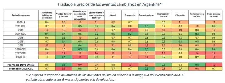 En ese sentido, la consultora eligió hacer un promedio del traslado a precios de los últimos saltos cambiarios desde el 2008 al 2023. “En promedio, en los primeros 6 meses después del salto cambiario se traslada a precios el 80% de la magnitud del salto”, señaló; sin embargo, hizo una excepción al tomar como referencia la salida del cepo de 2015-2016: “Tuvo un traslado a precios bajo comparado con el resto de las experiencias recientes: 60% en los siguientes 6 meses después de la corrección cambiaria”, añadió.