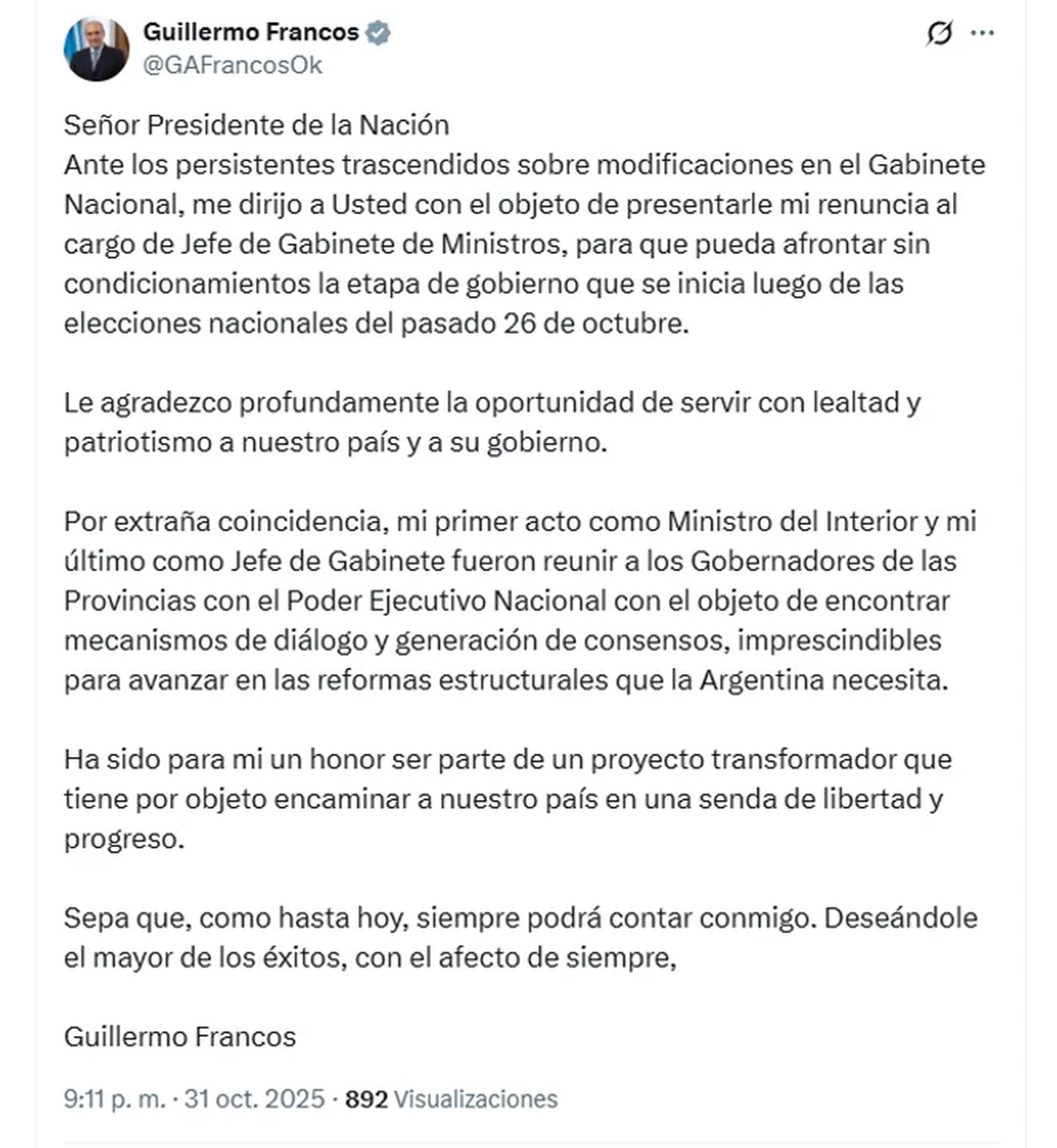En su mensaje, Francos escribió: “Señor Presidente de la Nación: ante los persistentes trascendidos sobre modificaciones en el Gabinete Nacional, me dirijo a Usted con el objeto de presentarle mi renuncia al cargo de Jefe de Gabinete de Ministros, para que pueda afrontar sin condicionamientos la etapa de gobierno que se inicia luego de las elecciones nacionales del pasado 26 de octubre”.