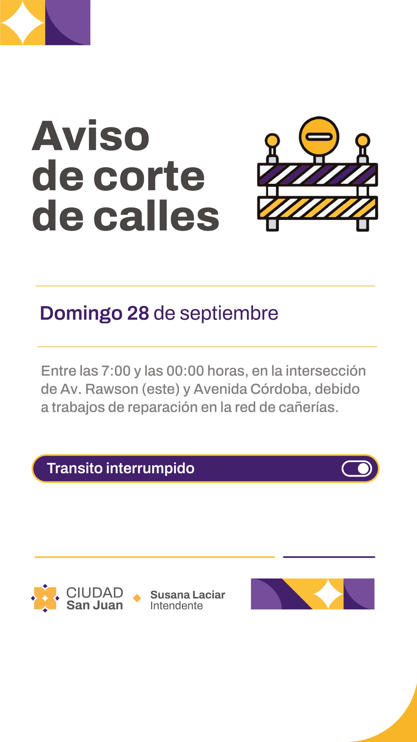 La Municipalidad de la Ciudad de San Juan informa que el domingo 28 de septiembre, entre las 7:00 y las 00:00 horas, se interrumpirá el tránsito vehicular en la intersección de Av. Rawson (este) y Avenida Córdoba, debido a trabajos de reparación en la red de cañerías.