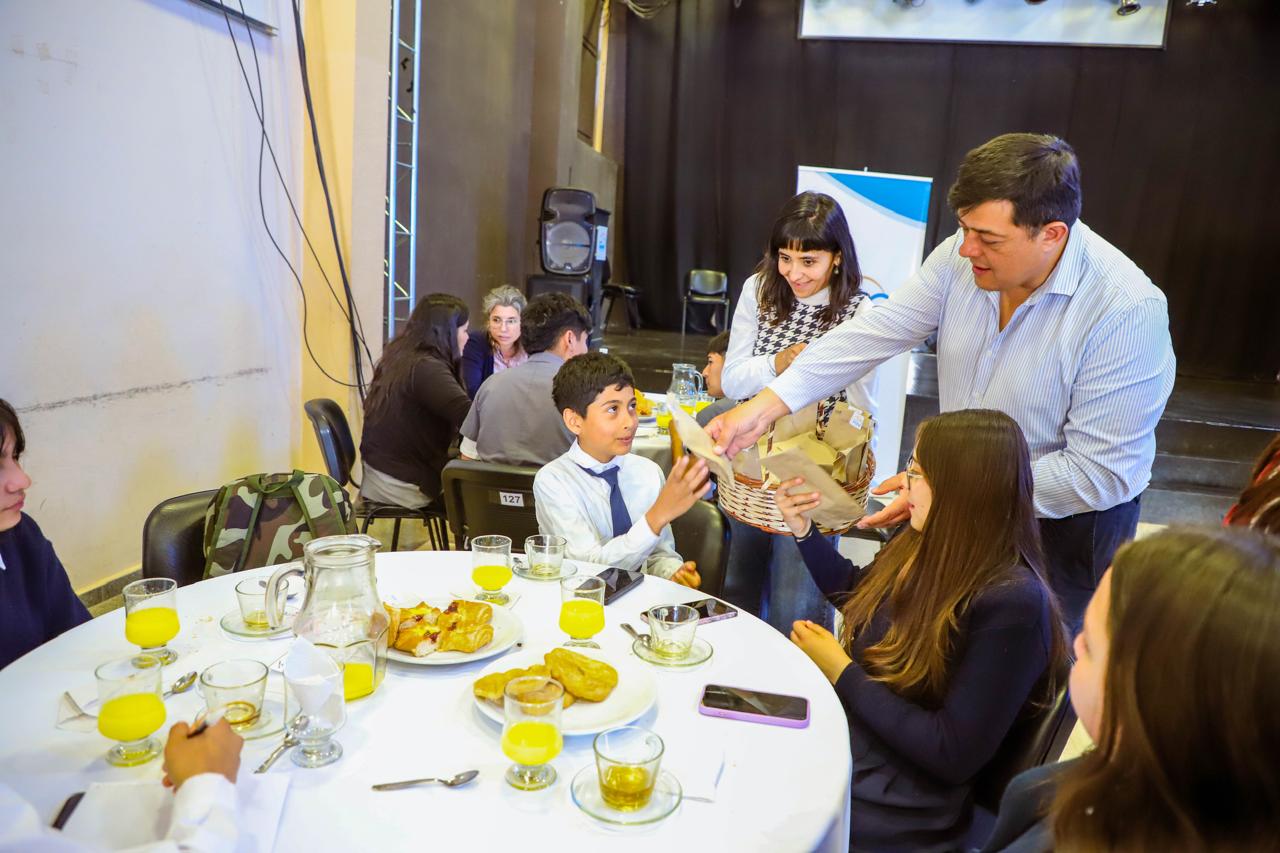 Este martes 16 de septiembre, jóvenes de distintas escuelas de Jáchal participaron de un desayuno organizado por la Municipalidad, en el que se generó un espacio de diálogo e intercambio entre autoridades y estudiantes. El intendente Espejo destacó la importancia de fortalecer los vínculos intergeneracionales y agradeció la participación de los jóvenes en la actividad.