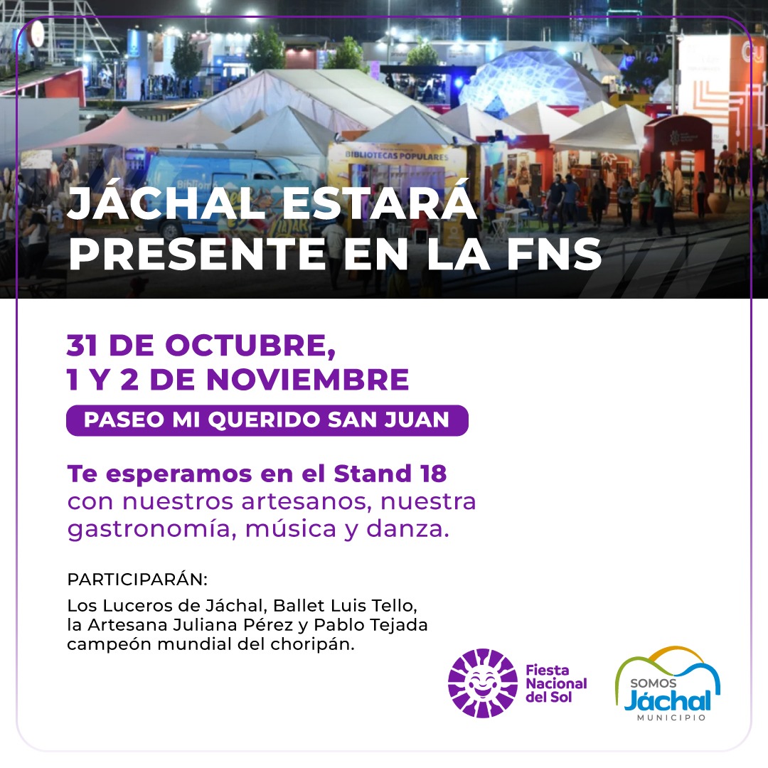 El departamento de Jáchal estará presente en la Fiesta Nacional del Sol, que se llevará a cabo del 31 de octubre al 2 de noviembre en el Estadio del Bicentenario. Contará con un espacio propio donde los visitantes podrán disfrutar de la rica gastronomía local, el talento de artesanos de la región y una variedad de actividades recreativas.