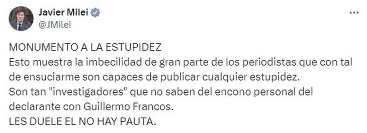 MONUMENTO A LA ESTUPIDEZ. Esto muestra la imbecilidad de gran parte de los periodistas que con tal de ensuciarme son capaces de publicar cualquier estupidez. Son tan “investigadores” que no saben del encono personal del declarante con Guillermo Francos. LES DUELE EL NO HAY PAUTA”, dijo respecto a la circulación de las declaraciones de Claver-Carone en medios argentinos.
