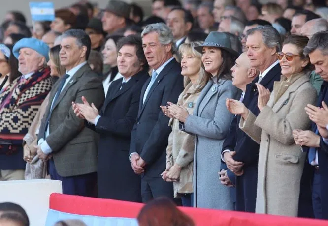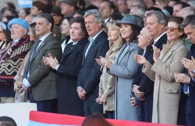 Una ausencia que se hizo notar es la de la vicepresidenta Victoria Villarruel. Por otro lado, el Presidente ingresó al predio por un sector distinto al del jefe de Gobierno porteño Jorge Macri, también presente junto a su esposa María Belén Ludueña, por lo que ambas fuerzas no se saludaron.
