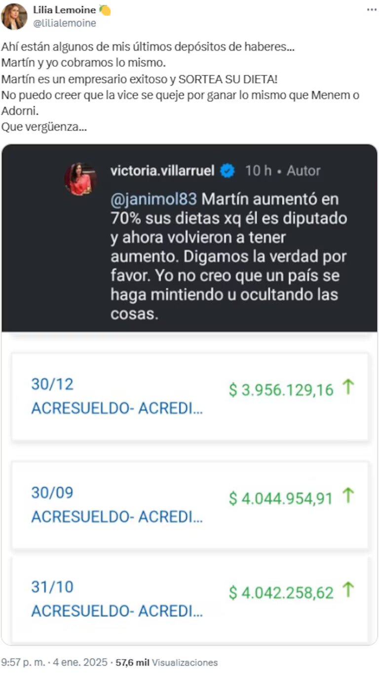 Por otro lado, Lemoine reanudó sus críticas en contra de la vicepresidente, para asegurar que ganaría el mismo sueldo que Menem y Adorni. Junto a una captura de pantalla de los últimos haberes depositados por su función como diputada, la legisladora sentenció: “Martín y yo cobramos lo mismo”, al señalar que ambos percibirían un monto aproximado de 4 millones de pesos.