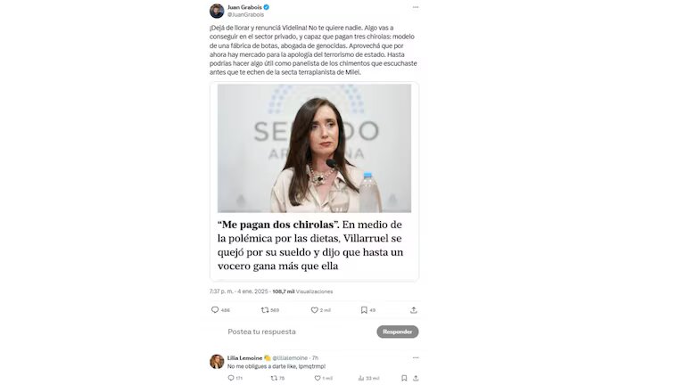 Después de que Victoria Villarruelcongelara los sueldos de los senadores y se quejara del monto que percibe, Juan Grabois se sumó a la ola de críticas que recayeron sobre la vicepresidente por asegurar que “en breve me pagan dos chirolas”. El dirigente no solo le pidió que renunciara a su cargo, sino que recibió el respaldo de la diputada libertaria Lilia Lemoine.