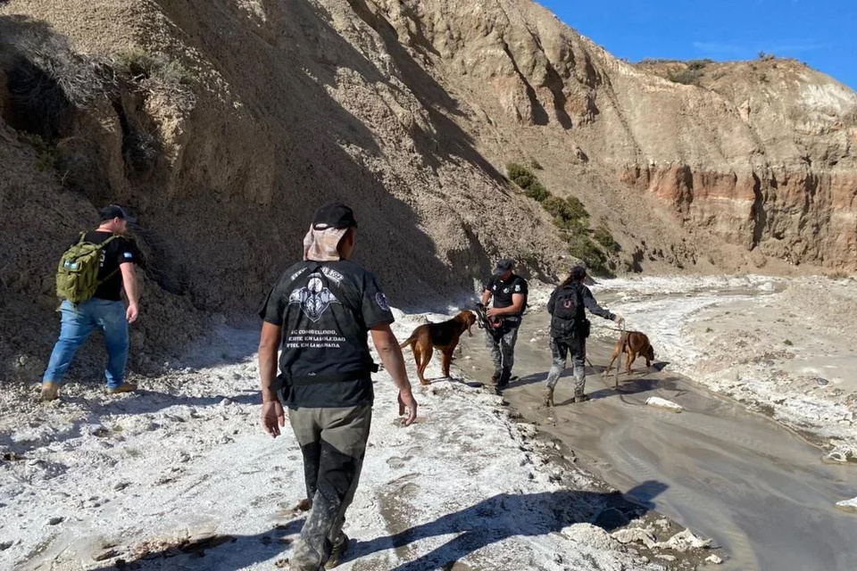 La búsqueda de los jubilados se centra en los alrededores del Cañadón de Visser, un sector con un terreno abrupto y peligroso, caracterizado por rocas rojizasgrietas profundas, y una superficie erosionada y lodosa, propensa a la formación rápida de sumideros naturales.
