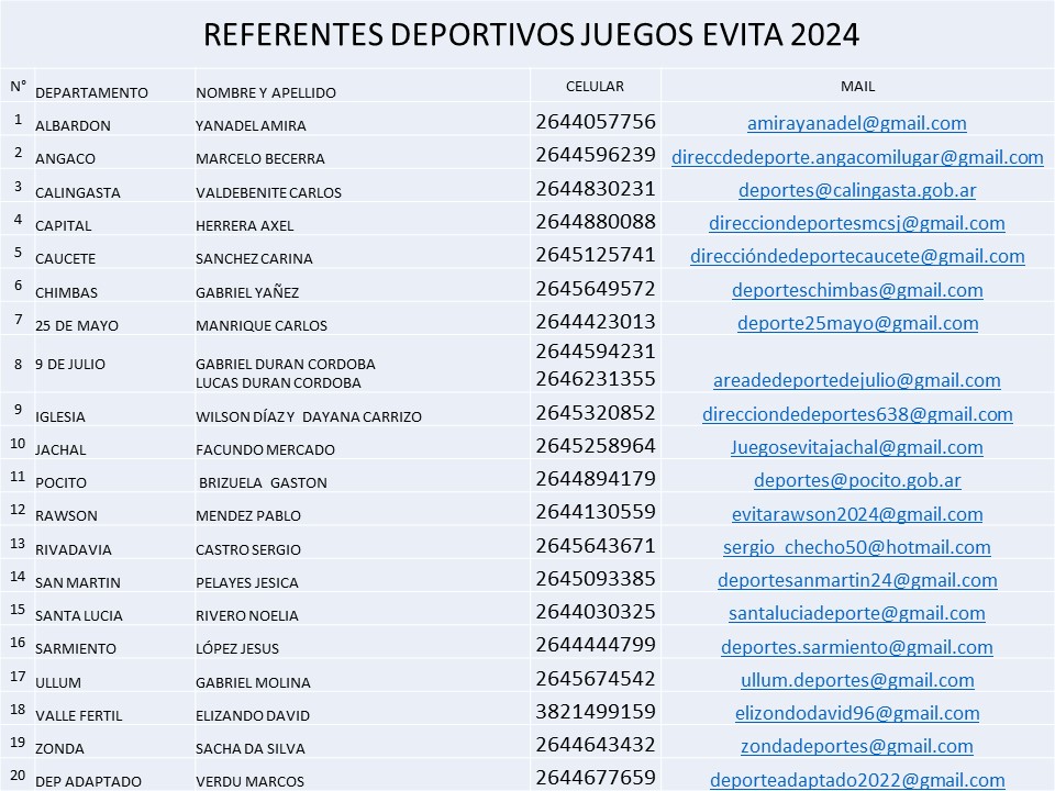 Finalmente, la etapa provincial, se disputará en el departamento Capital o departamentos aledaños del 24 al 28 de septiembre. En esta instancia final, llegarán los seis ganadores zonales en cada disciplina deportiva y los campeones serán los que representen a San Juan en los Juegos Evita Nacionales en Mar del Plata.
