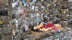 Desde temprano, el paisaje característico del santuario volvió a tomar forma con imágenes típicas: botellas de agua apiladas, velas encendidas y ofrendas que los creyentes dejaron como muestra de devoción. La calma predominó durante gran parte del día, aunque la presencia de visitantes fue sostenida.