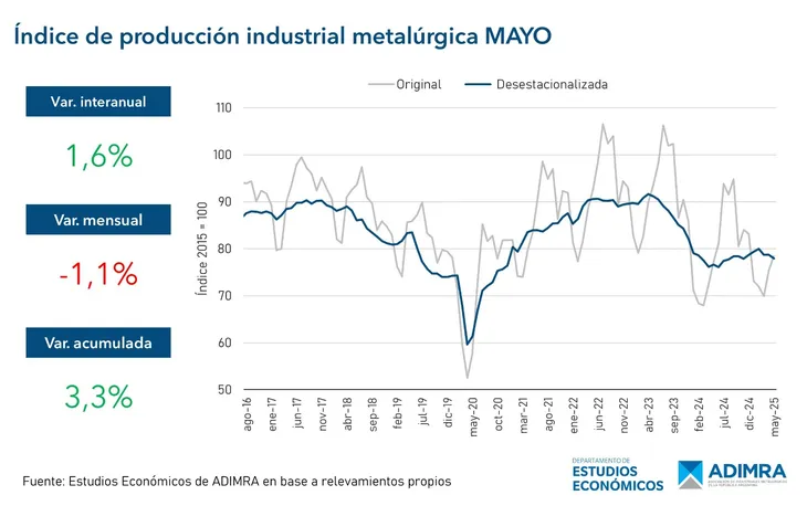La actividad de la industria metalúrgica registró en mayo pasado un retroceso de 1,1% respecto del mes pasado y una variación interanual de 1,6%. De esta manera, el sector acumula un crecimiento de 3,3% en lo que va de 2025, en la comparación contra el mismo período del 2024, aunque el nivel actual se encuentra un 11,7% por debajo del promedio de 2023 y un 14,5% por debajo de los niveles históricos más altos.