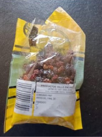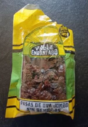 - Pasas de uva jumbo sin semillas, marca Valle Encantado, Fraccionado por Productos Valle Encantado, Mitre (E) 1117 – San Juan, RNE N° 018125698, RNPA N° 1819992916”.