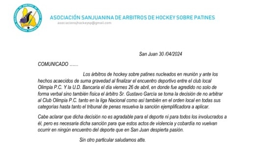 La Asociación Sanjuanina de Árbitros de Hockey Sobre Patines lanzó un comunicado después de que el árbitro Gustavo García sufriera un violento ataque al término del partido entre Olimpia y Bancaria en el torneo de la SuperLiga.