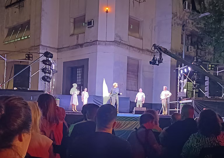 Era un paisaje extraño si se compara el evento de este miércoles con los clásicos festejos del 17 de octubre, en donde había militancia en la calle, bombos y toda la liturgia peronista. Esta vez, en cambio, hubo menos gente, nada de bombos y, sobre todo, mucha tecnología: mapping sobre el edificio de la CGT utilizado como una pantalla gigante, dos drones sobrevolando la zona para filmar y transmisión en streaming. También hubo actores, bailarines y cantantes de rap para recrear algunas situaciones del 17 de octubre de 1945.