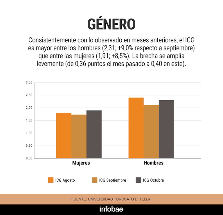 En términos demográficos, el ICG de octubre fue 2,22 puntos entre los hombres, lo que implica una mejora del 4,7% respecto de septiembre. En las mujeres, el índice subió 10,8% y alcanzó los 1,95 puntos. El segmento etario que mostró mayor confianza fue el de jóvenes de 18 a 29 años, con un ICG de 2,71 puntos, tras un incremento del 9,6%. Le siguieron los adultos de 30 a 49 años (1,96 puntos, +4,8%) y las personas mayores de 50 años (1,86 puntos, +1,5%).