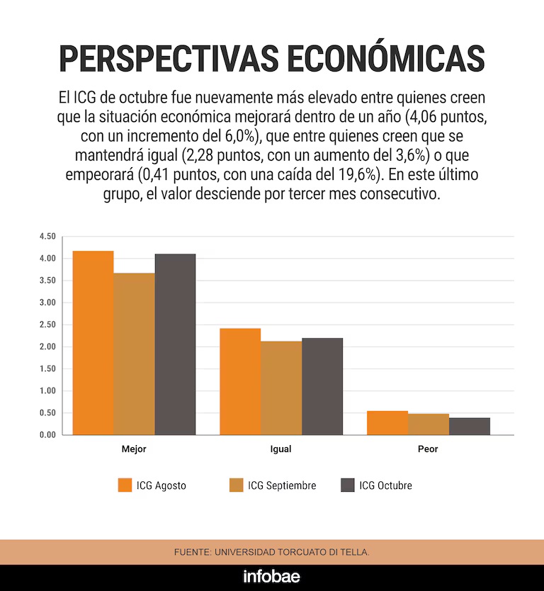 Las expectativas económicas volvieron a tener un peso determinante. El ICG alcanzó 3,84 puntos entre quienes creen que la situación económica mejorará en un año (+0,2%), y fue de 2,16 puntos para quienes piensan que se mantendrá igual (+2,7%). Por su parte, aquellos que anticipan un empeoramiento registraron un ICG de 0,62 puntos, aunque con un incremento del 21,6% respecto de septiembre.