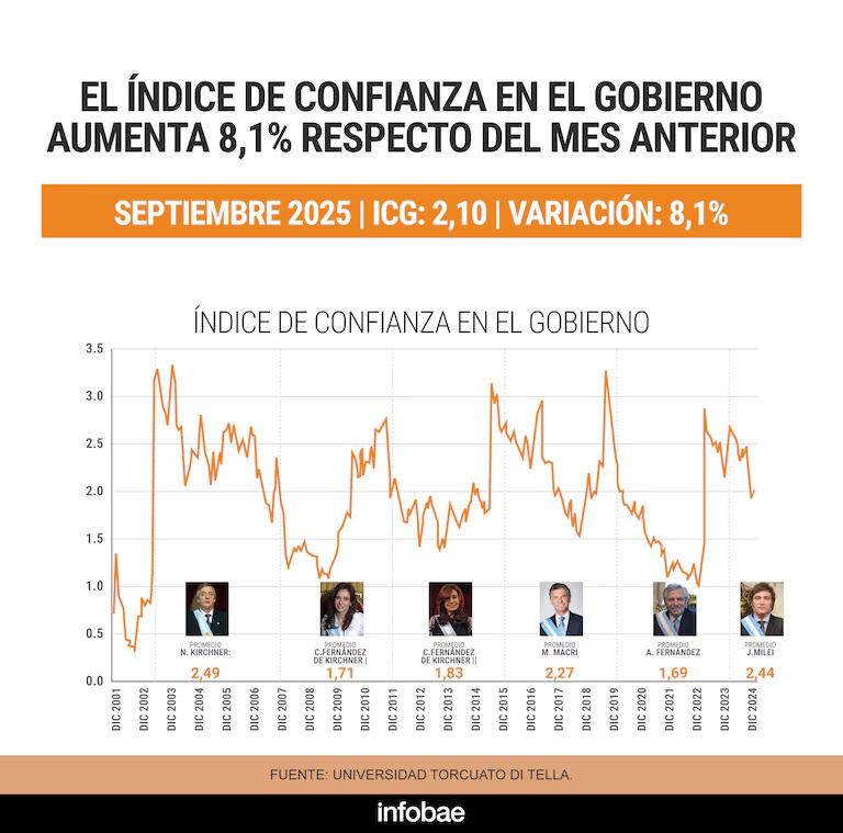 Luego de dos meses consecutivos de caída, el Índice de Confianza en el Gobierno (ICG) elaborado por la Universidad Torcuato Di Tella registró en octubre de 2025 un repunte del 8,1% en comparación con septiembre, al alcanzar los 2,10 puntos en una escala de 0 a 5. El dato, difundido este lunes por la Escuela de Gobierno de esa casa de estudios, muestra una recuperación moderada en la percepción pública sobre la gestión del presidente Javier Milei, aunque el indicador aún se mantiene por debajo del promedio registrado durante su administración.
